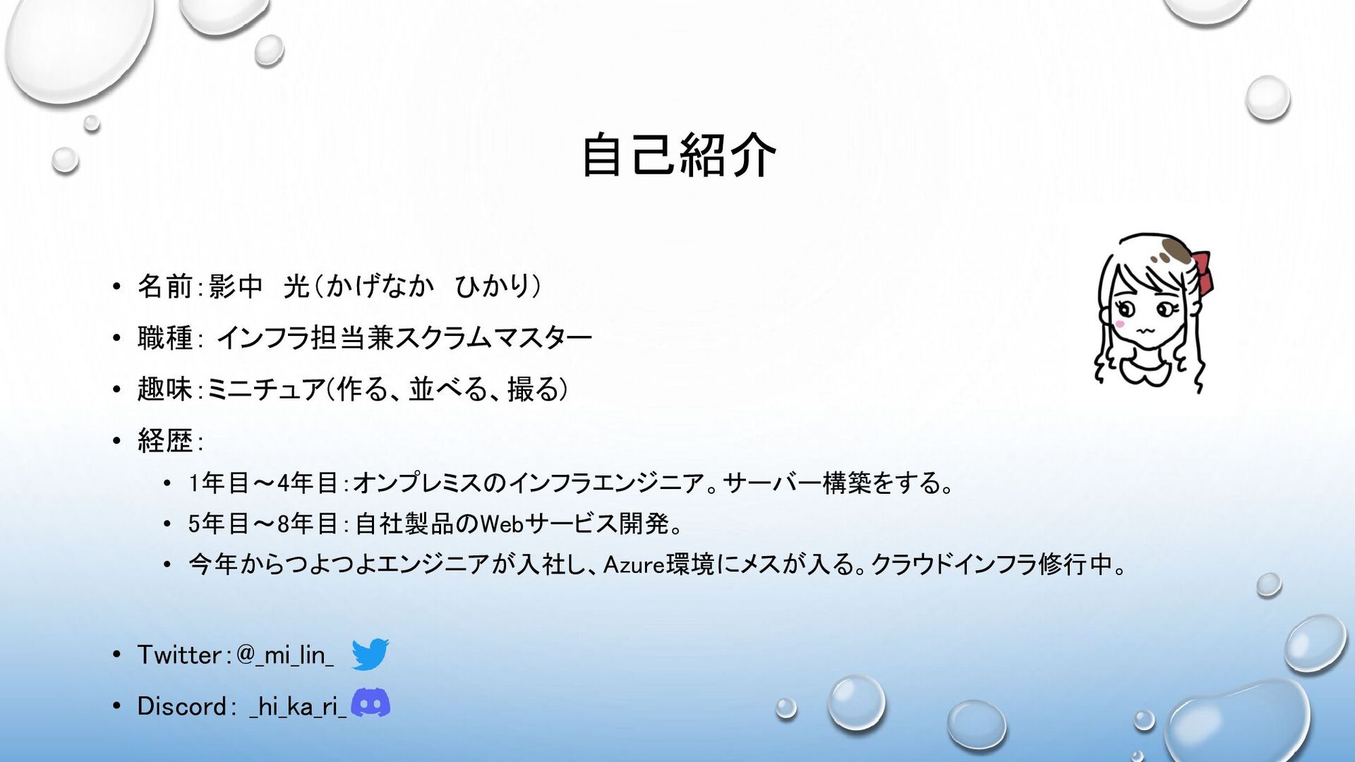 • 経歴: • 1年目~4年目:オンプレミスのインフラエンジニア。サーバー構築をする。 • 5年目~8年目:自社製品のWebサービス開発。 • 今年からつよつよエンジニアが入社し、Azure環境にメスが入る。クラウドインフラ修行中。 • Twitter:@_mi_lin_ • Discord: _hi_ka_ri_