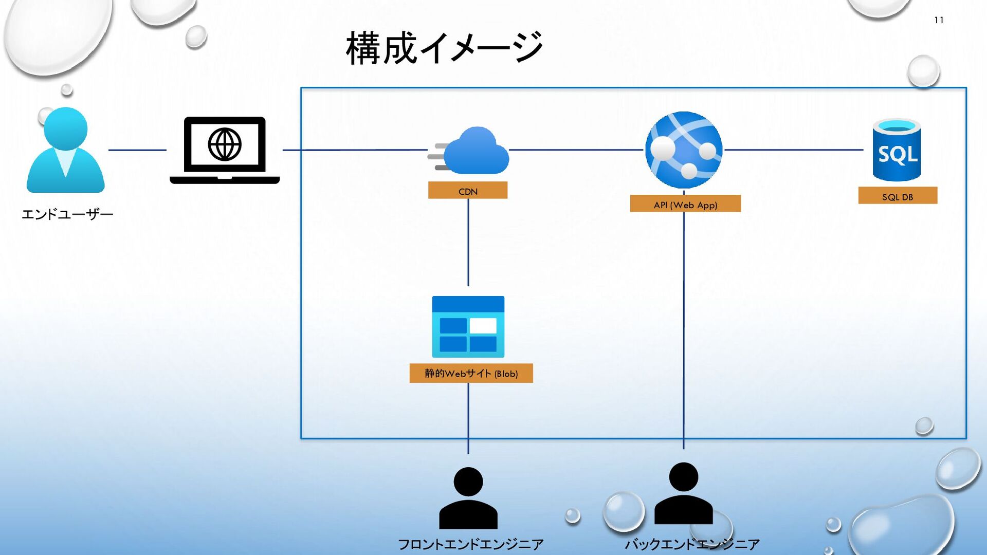 構成イメージ 11 バックエンドエンジニア エンドユーザー API (Web App) SQL DB フロントエンドエンジニア