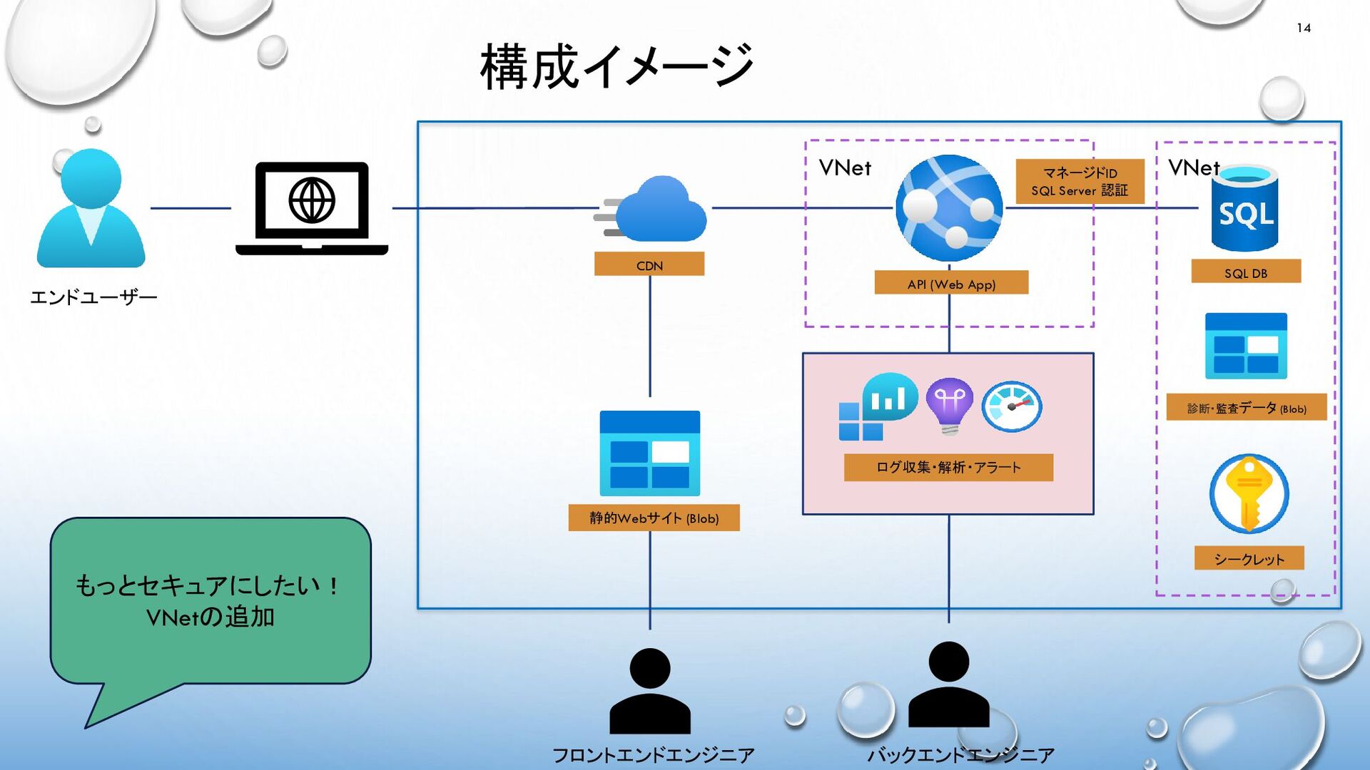 診断・監査データ (Blob) シークレット フロントエンドエンジニア 静的Webサイト (Blob) CDN VNet VNet もっとセキュアにしたい! VNetの追加 マネージドID SQL Server 認証