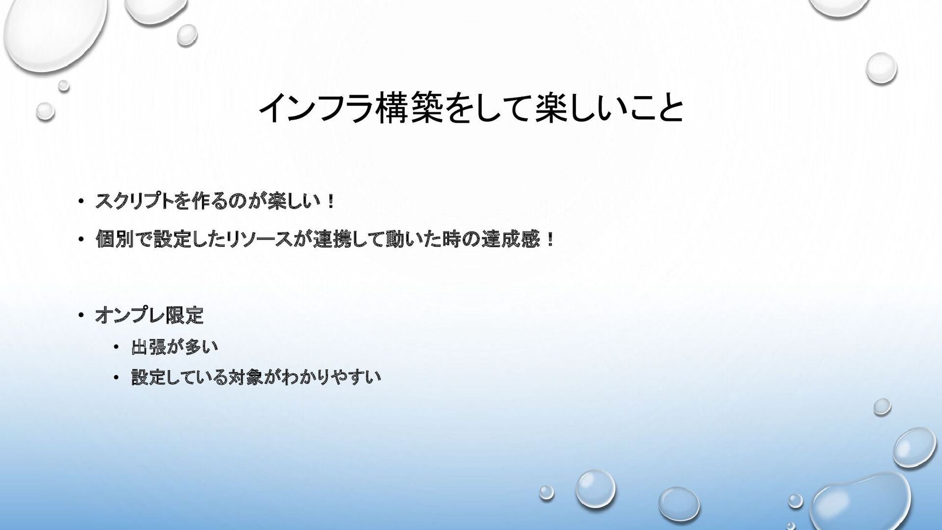 インフラ構築をして楽しいこと • スクリプトを作るのが楽しい! • 個別で設定したリソースが連携して動いた時の達成感! • オンプレ限定 • 出張が多い •