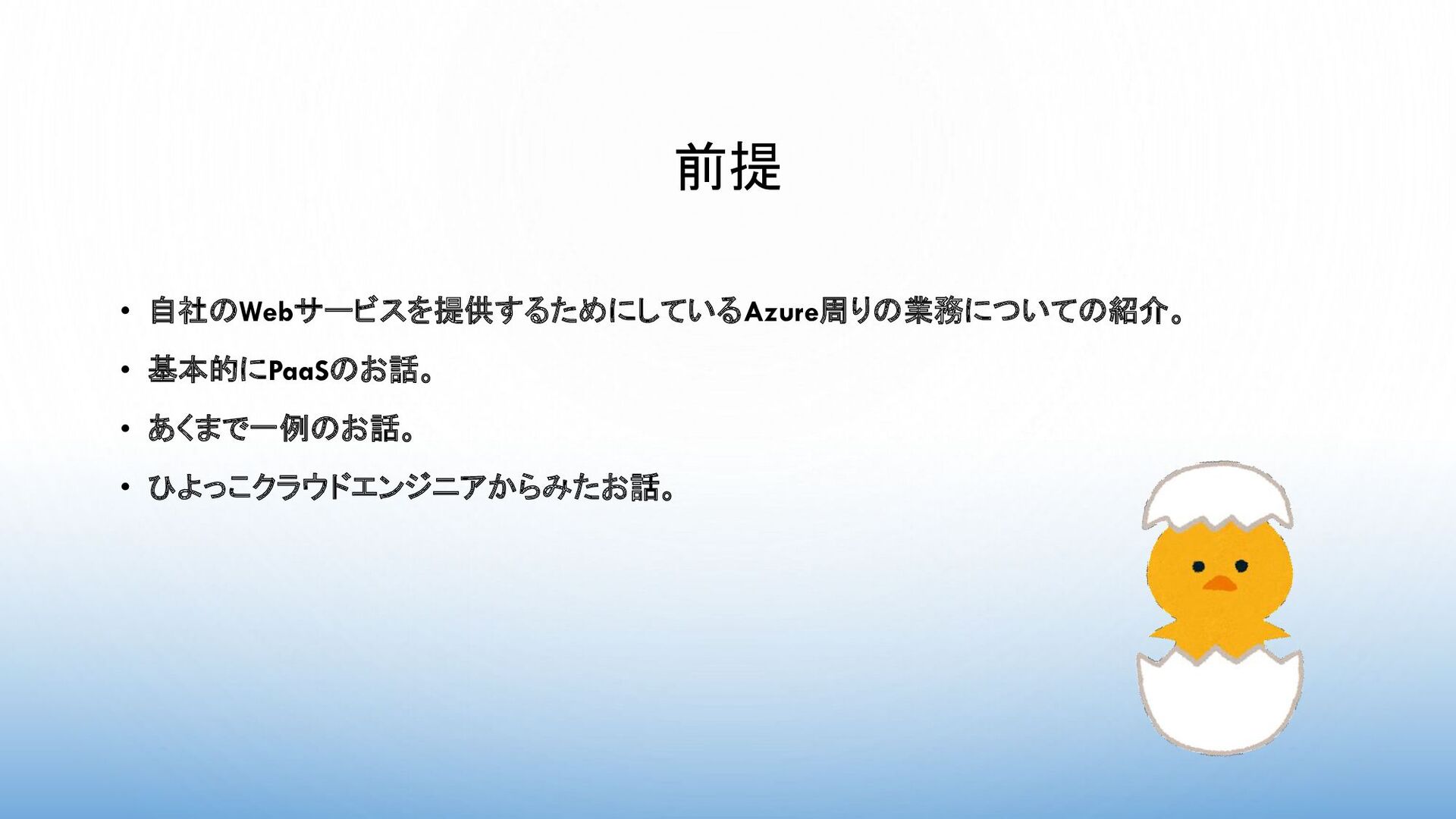 前提 • 自社のWebサービスを提供するためにしているAzure周りの業務についての紹介。 • 基本的にPaaSのお話。 • あくまで一例のお話。 • ひよっこクラウドエンジニアからみたお話。