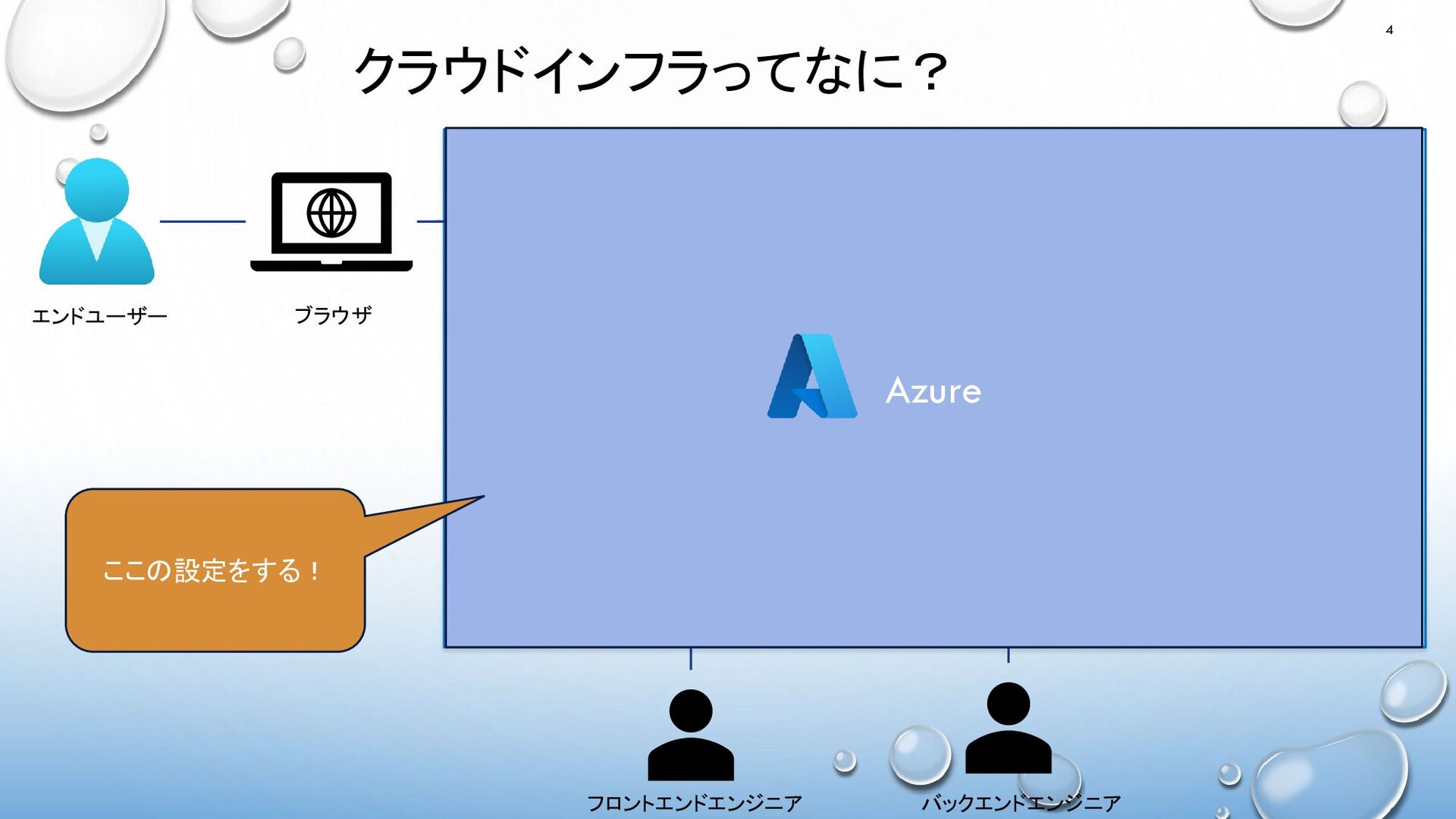 フロントエンドエンジニア 静的Webサイト (Blob) CDN クラウドインフラってなに? 4 Azure バックエンドエンジニア エンドユーザー ここの設定をする!