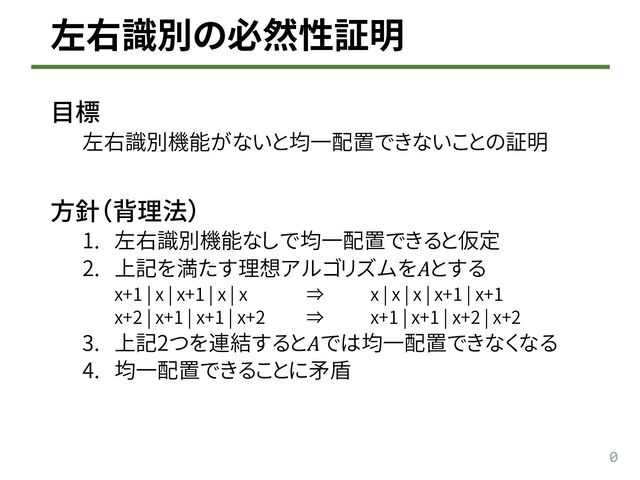 0 左右識別の必然性証明 目標 左右識別機能がないと均一配置できないことの証明 方針(背理法) 1. 左右識別機能なしで均一配置できると仮定 2. 上記を満たす理想アルゴリズムを𝐴とする x+1