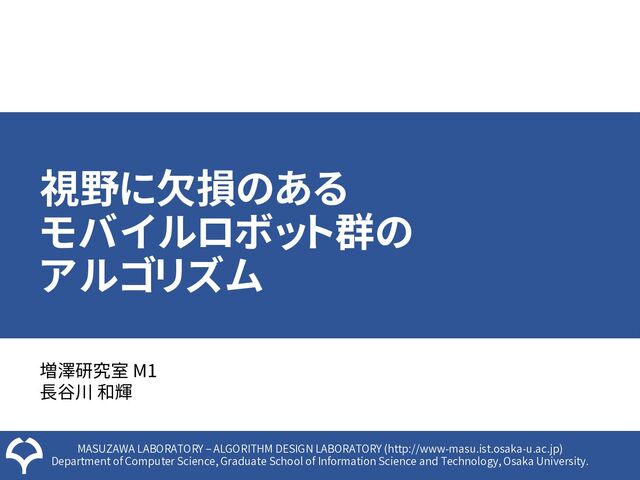 Science, Graduate School of Information Science and Technology, Osaka University. 視野に欠損のある モバイルロボット群の アルゴリズム 増澤研究室 M1 長谷川 和輝