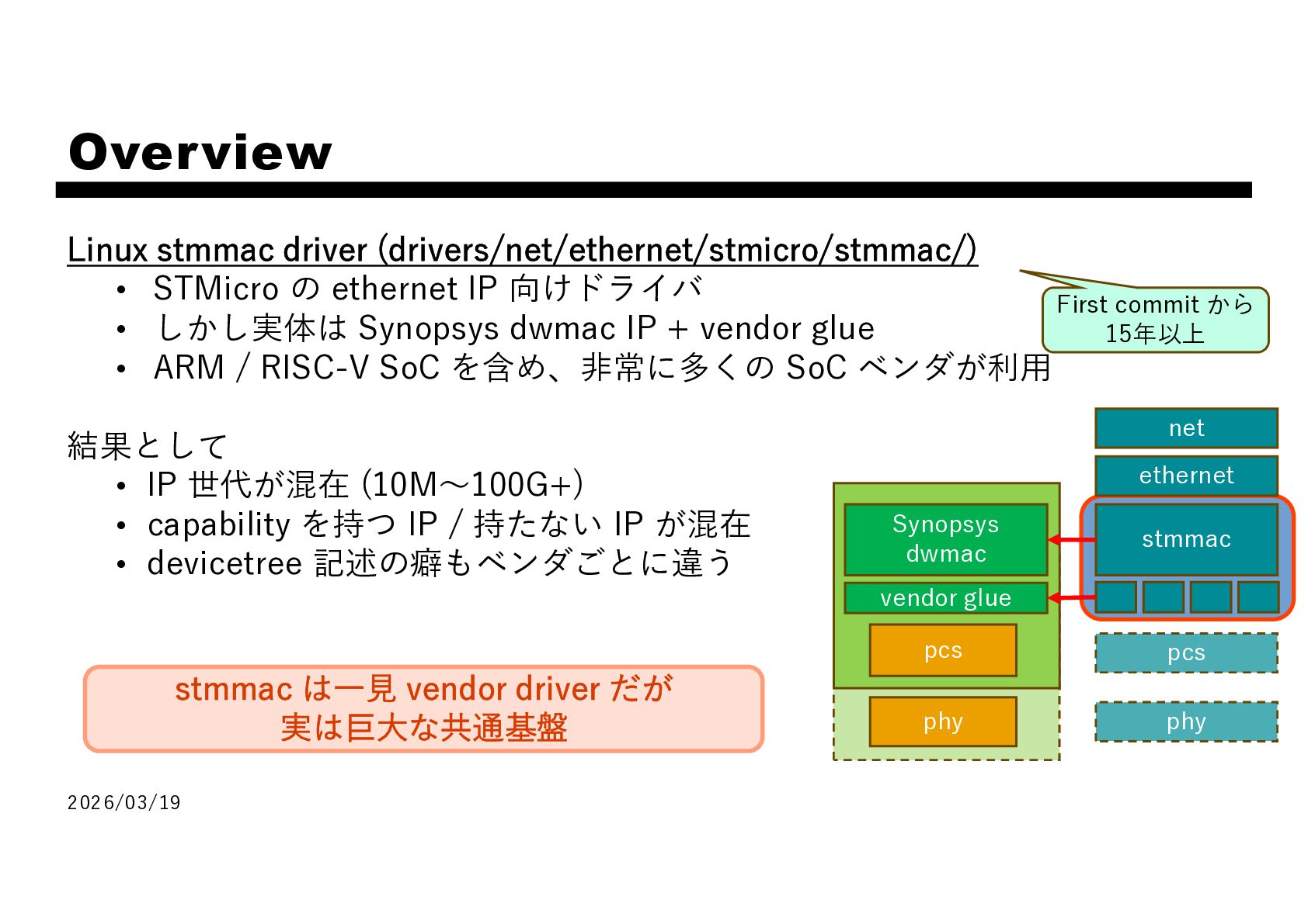 • しかし実体は Synopsys dwmac IP + vendor glue • ARM / RISC-V SoC を含め、非常に多くの SoC ベンダが利用 結果として • IP 世代が混在 (10M~100G+) • capability を持つ IP / 持たない IP が混在 • devicetree 記述の癖もベンダごとに違う Overview 2026/03/19 vendor glue Synopsys dwmac pcs phy net ethernet stmmac stmmac は一見 vendor driver だが 実は巨大な共通基盤 pcs phy First commit から 15年以上
