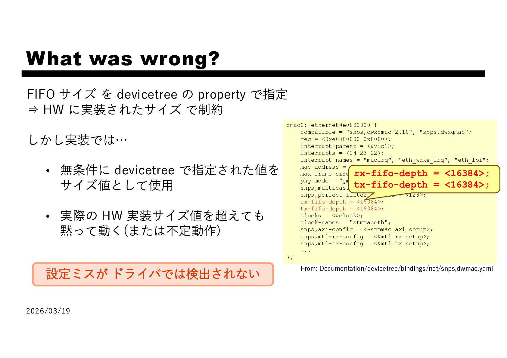 で指定 ⇒ HW に実装されたサイズ で制約 しかし実装では… • 無条件に devicetree で指定された値を サイズ値として使用 • 実際の HW 実装サイズ値を超えても 黙って動く(または不定動作) 設定ミスが ドライバでは検出されない gmac0: ethernet@e0800000 { compatible = "snps,dwxgmac-2.10", "snps,dwxgmac"; reg = <0xe0800000 0x8000>; interrupt-parent = <&vic1>; interrupts = <24 23 22>; interrupt-names = "macirq", "eth_wake_irq", "eth_lpi"; mac-address = [000000000000]; max-frame-size = <3800>; phy-mode = "gmii"; snps,multicast-filter-bins = <256>; snps,perfect-filter-entries = <128>; rx-fifo-depth = <16384>; tx-fifo-depth = <16384>; clocks = <&clock>; clock-names = "stmmaceth"; snps,axi-config = <&stmmac_axi_setup>; snps,mtl-rx-config = <&mtl_rx_setup>; snps,mtl-tx-config = <&mtl_tx_setup>; ... }; From: Documentation/devicetree/bindings/net/snps,dwmac.yaml rx-fifo-depth = <16384>; tx-fifo-depth = <16384>;
