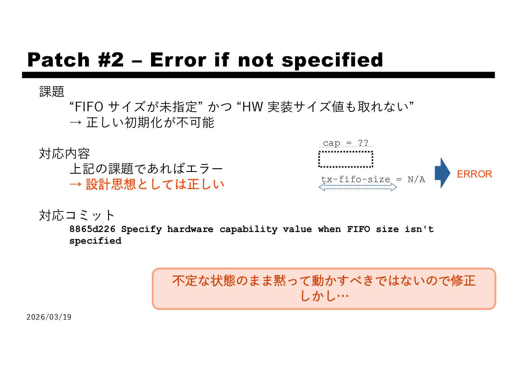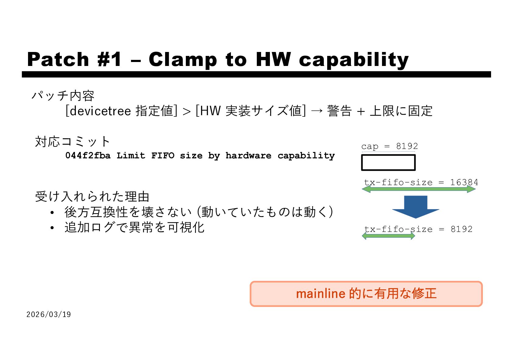 指定値] > [HW 実装サイズ値] → 警告 + 上限に固定 対応コミット 044f2fba Limit FIFO size by hardware capability 受け入れられた理由 • 後方互換性を壊さない (動いていたものは動く) • 追加ログで異常を可視化 mainline 的に有用な修正 tx-fifo-size = 16384 cap = 8192 tx-fifo-size = 8192