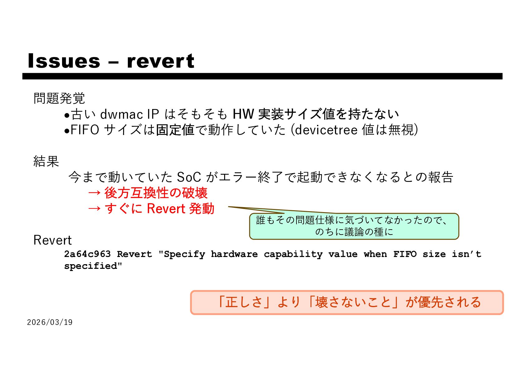 実装サイズ値を持たない FIFO サイズは固定値で動作していた (devicetree 値は無視) 結果 今まで動いていた SoC がエラー終了で起動できなくなるとの報告 → 後方互換性の破壊 → すぐに Revert 発動 Revert 2a64c963 Revert "Specify hardware capability value when FIFO size isn’t specified" 「正しさ」より「壊さないこと」が優先される 誰もその問題仕様に気づいてなかったので、 のちに議論の種に