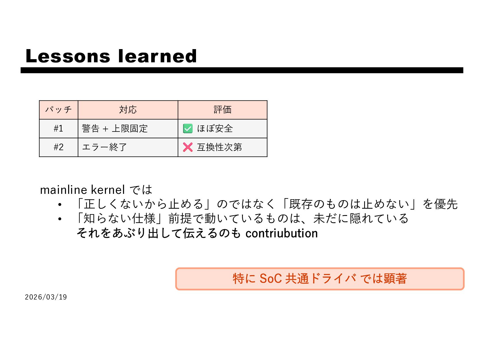 設計:分からないならエラーにすべき • 歴史:分からない IP が普通にあった • 現実:それで動いている環境が存在する ⇒ どれも否定できない Mainline の判断は「正しさ」よりも「互換性重視」 ⇒ Revert は失敗ではなく、「隠れていた仕様」が見えた 巨大ドライバを直すということは 「仕様を直す」ことではなく「バランスを取る」こと