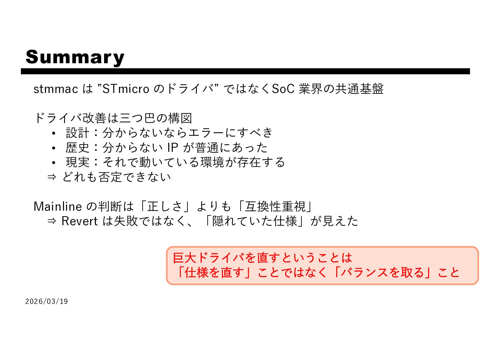 Summary 2026/03/19 stmmac は ”STmicro のドライバ” ではなくSoC 業界の共通基盤 ドライバ改善は三つ巴の構図 •