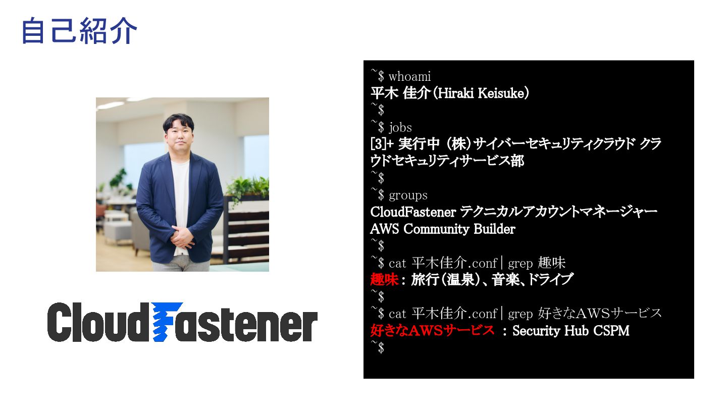 [3]+ 実行中 (株)サイバーセキュリティクラウド クラ ウドセキュリティサービス部 ~$ ~$ groups CloudFastener テクニカルアカウントマネージャー AWS Community Builder ~$ ~$ cat 平木佳介.conf | grep 趣味 趣味: 旅行(温泉)、音楽、ドライブ ~$ ~$ cat 平木佳介.conf | grep 好きなAWSサービス 好きなAWSサービス : Security Hub CSPM ~$