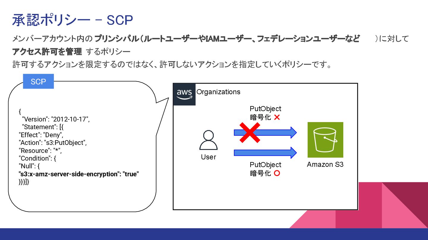Organizations Amazon S3 User PutObject 暗号化 ✕ PutObject 暗号化 〇 { "Version": "2012-10-17", "Statement": [{ "Effect": "Deny", "Action": "s3:PutObject", "Resource": "*", "Condition": { "Null": { "s3:x-amz-server-side-encryption": "true" }}}]} SCP