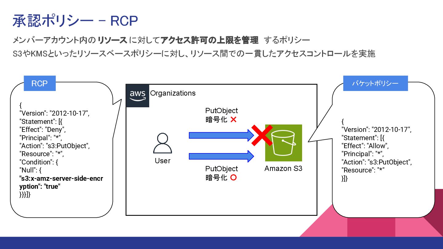 承認ポリシー - RCP メンバーアカウント内の リソース に対してアクセス許可の上限を管理 するポリシー S3やKMSといったリソースベースポリシーに対し、リソース間での一貫したアクセスコントロールを実施 Organizations