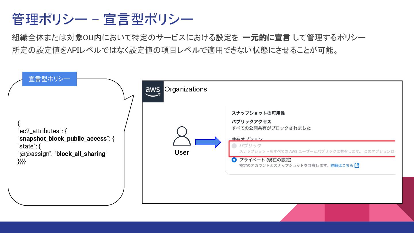 管理ポリシー - 宣言型ポリシー 組織全体または対象OU内において特定のサービスにおける設定を 一元的に宣言 して管理するポリシー 所定の設定値をAPIレベルではなく設定値の項目レベルで適用できない状態にさせることが可能。 Organizations