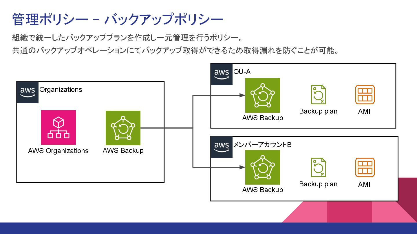 OU-A メンバーアカウントB Organizations 管理ポリシー - バックアップポリシー 組織で統一したバックアッププランを作成し一元管理を行うポリシー。 共通のバックアップオペレーションにてバックアップ取得ができるため取得漏れを防ぐことが可能。