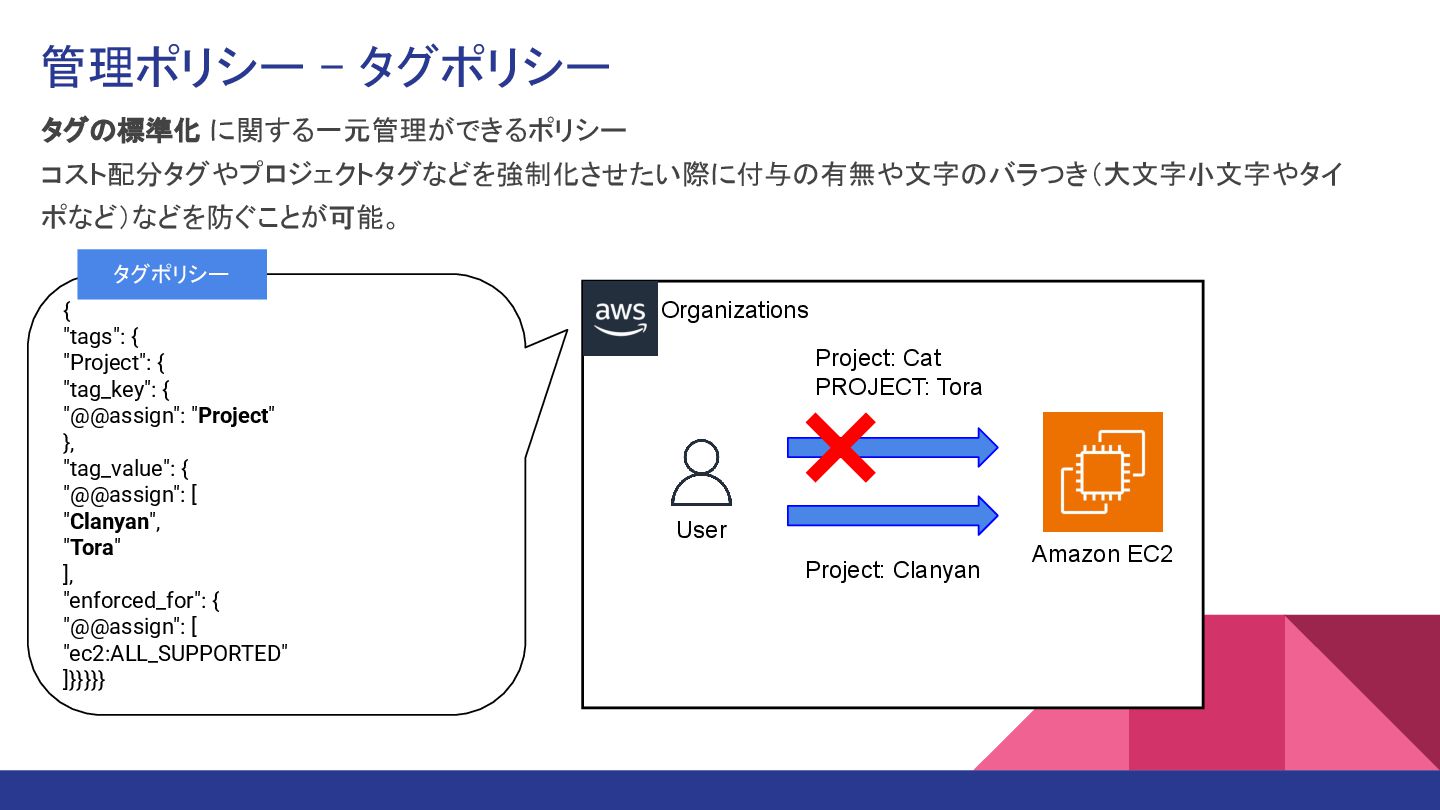 管理ポリシー - タグポリシー タグの標準化 に関する一元管理ができるポリシー コスト配分タグやプロジェクトタグなどを強制化させたい際に付与の有無や文字のバラつき(大文字小文字やタイ ポなど)などを防ぐことが可能。 Organizations