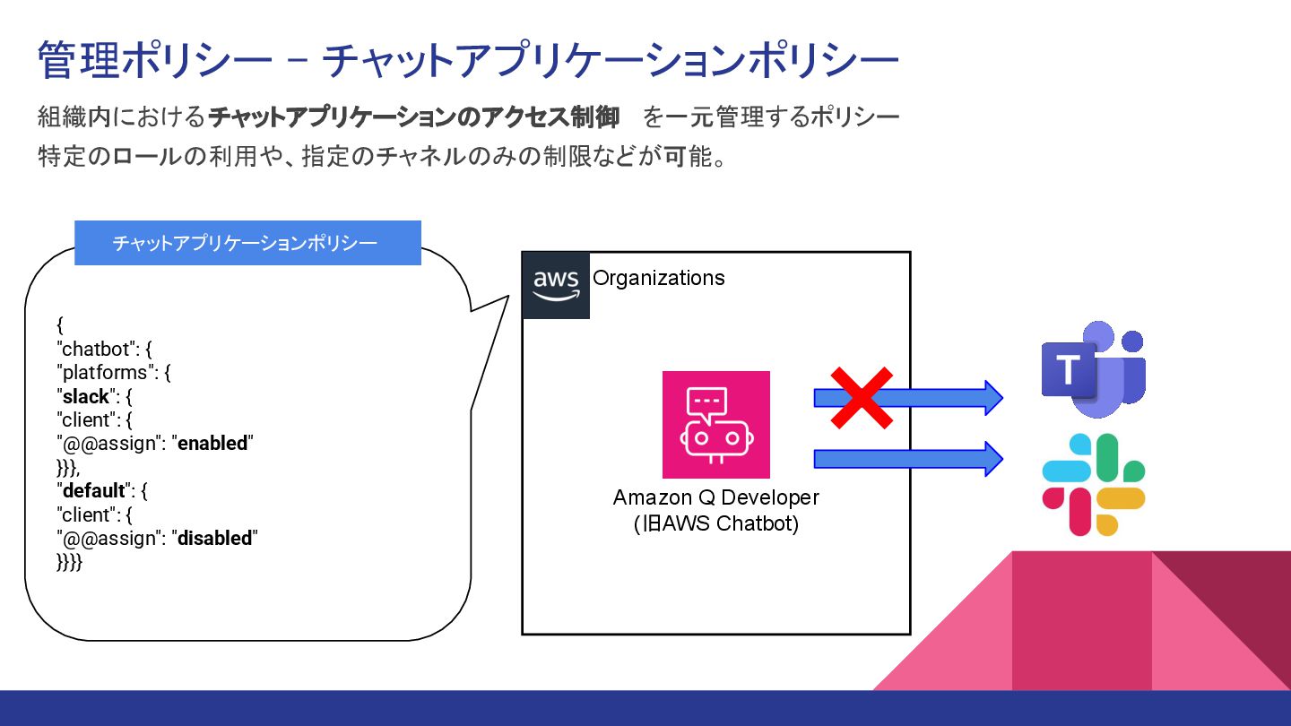 "chatbot": { "platforms": { "slack": { "client": { "@@assign": "enabled" }}}, "default": { "client": { "@@assign": "disabled" }}}} チャットアプリケーションポリシー Amazon Q Developer (旧AWS Chatbot)