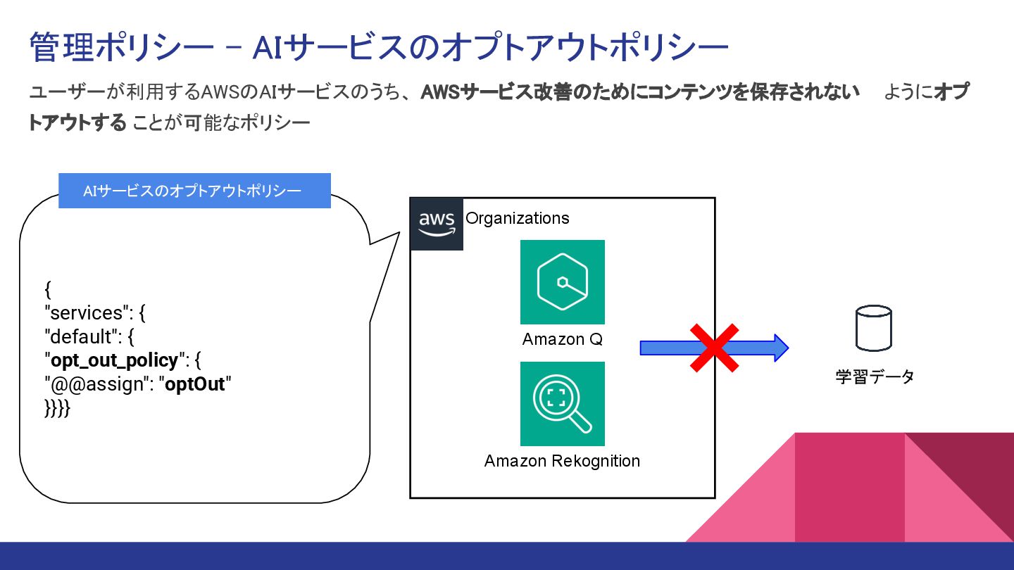 管理ポリシー - AIサービスのオプトアウトポリシー ユーザーが利用するAWSのAIサービスのうち、 AWSサービス改善のためにコンテンツを保存されない ようにオプ トアウトする ことが可能なポリシー