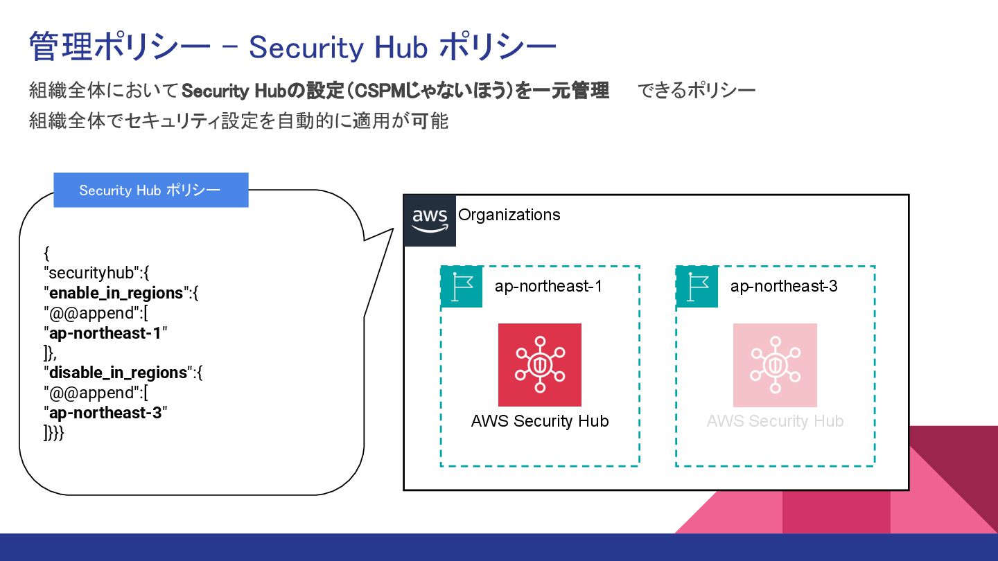 Organizations { "securityhub":{ "enable_in_regions":{ "@@append":[ "ap-northeast-1" ]}, "disable_in_regions":{ "@@append":[ "ap-northeast-3" ]}}} Security Hub ポリシー ap-northeast-1 ap-northeast-3 AWS Security Hub AWS Security Hub