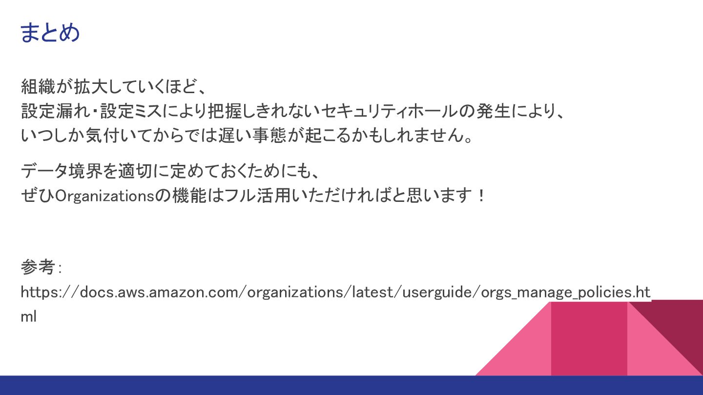 まとめ 組織が拡大していくほど、 設定漏れ・設定ミスにより把握しきれないセキュリティホールの発生により、 いつしか気付いてからでは遅い事態が起こるかもしれません。 データ境界を適切に定めておくためにも、 ぜひOrganizationsの機能はフル活用いただければと思います! 参考: https://docs.aws.amazon.com/organizations/latest/userguide/orgs_manage_policies.ht ml