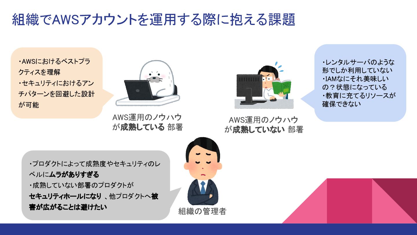クティスを理解 ・セキュリティにおけるアン チパターンを回避した設計 が可能 ・レンタルサーバのような 形でしか利用していない ・IAMなにそれ美味しい の?状態になっている ・教育に充てるリソースが 確保できない ・プロダクトによって成熟度やセキュリティのレ ベルにムラがありすぎる ・成熟していない部署のプロダクトが セキュリティホールになり 、他プロダクトへ被 害が広がることは避けたい 組織の管理者