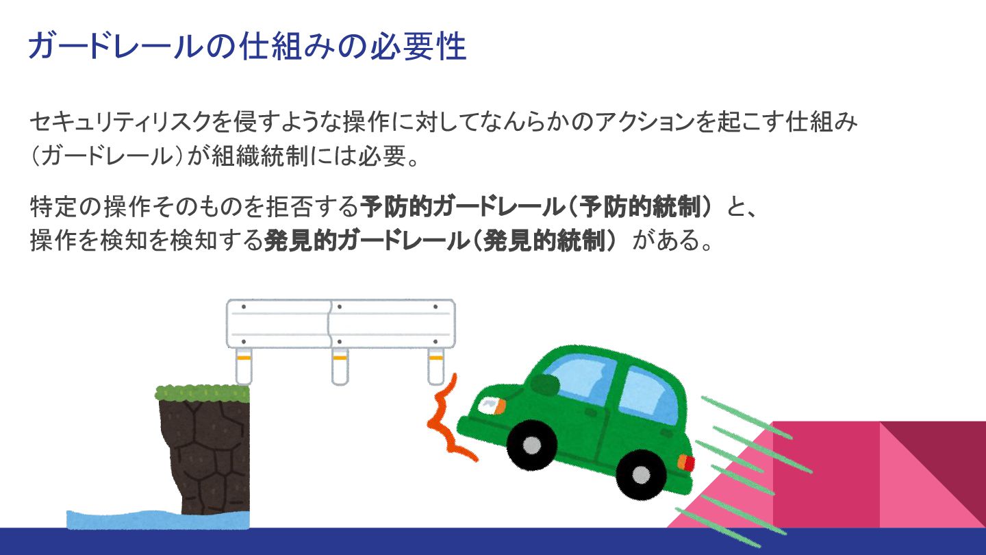 ガードレールの仕組みの必要性 セキュリティリスクを侵すような操作に対してなんらかのアクションを起こす仕組み (ガードレール)が組織統制には必要。 特定の操作そのものを拒否する予防的ガードレール(予防的統制) と、 操作を検知を検知する発見的ガードレール(発見的統制) がある。