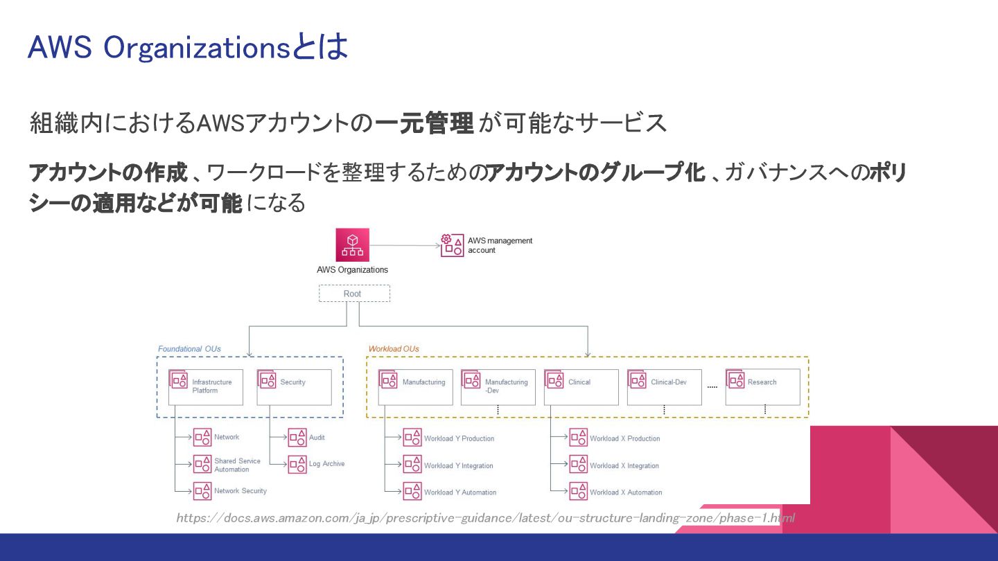 AWS Organizationsとは 組織内におけるAWSアカウントの一元管理が可能なサービス アカウントの作成、ワークロードを整理するための アカウントのグループ化 、ガバナンスへのポリ シーの適用などが可能 になる https://docs.aws.amazon.com/ja_jp/prescriptive-guidance/latest/ou-structure-landing-zone/phase-1.html