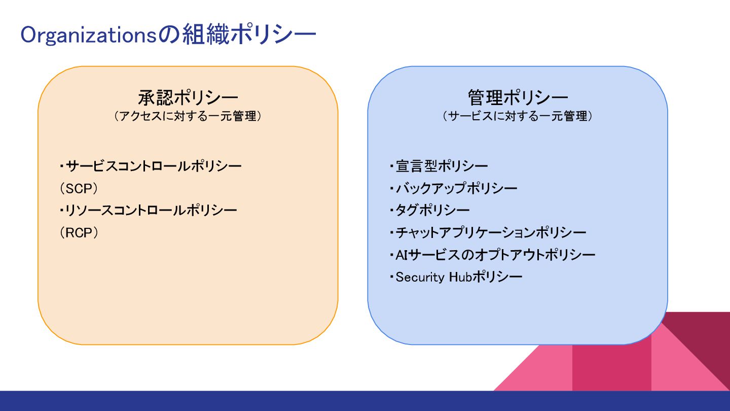 Organizationsの組織ポリシー 承認ポリシー (アクセスに対する一元管理) ・サービスコントロールポリシー (SCP) ・リソースコントロールポリシー