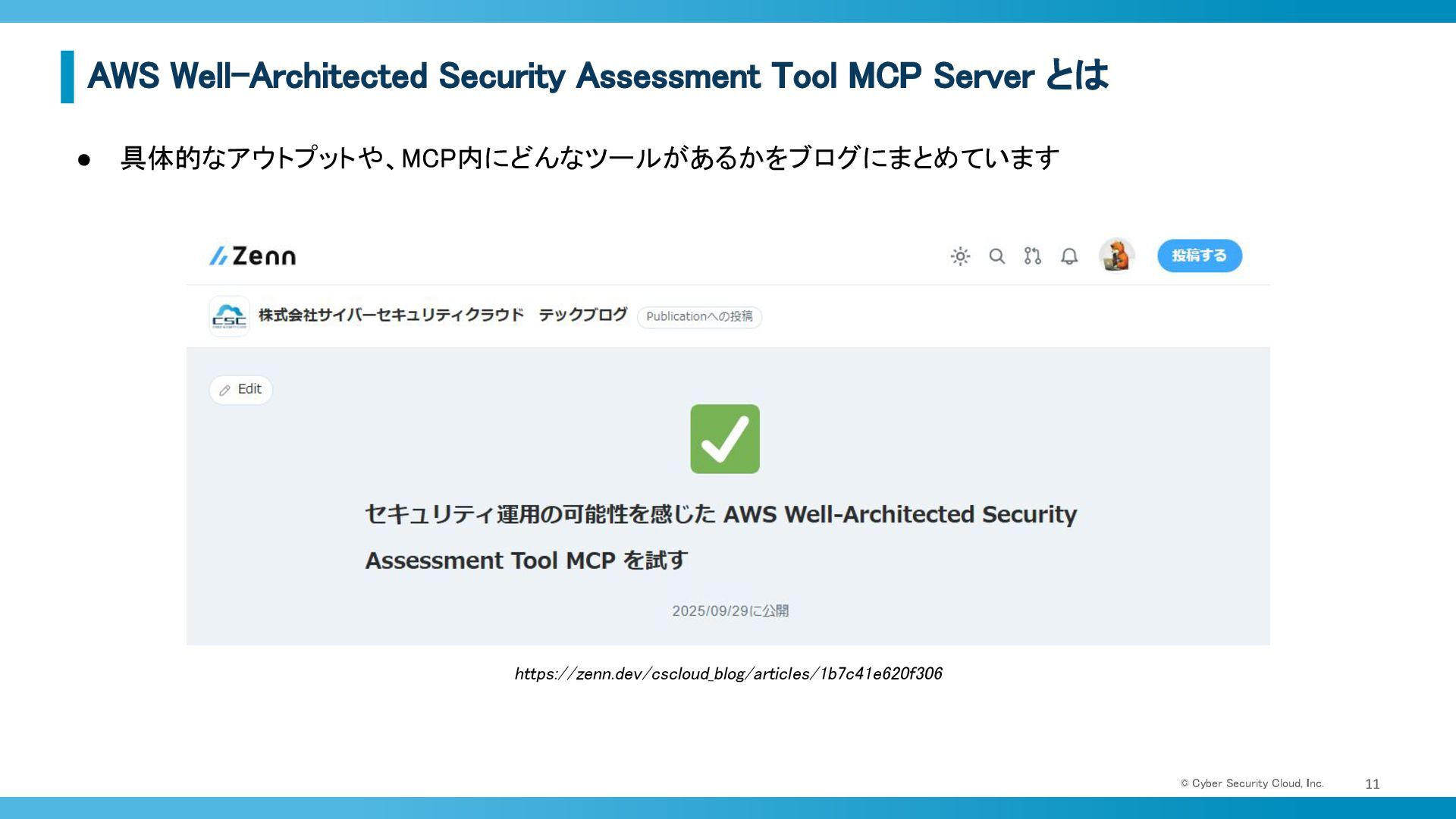 Cyber Security Cloud, Inc. 11 • 具体的なアウトプットや、MCP内にどんなツールがあるかをブログにまとめています https://zenn.dev/cscloud_blog/articles/1b7c41e620f306