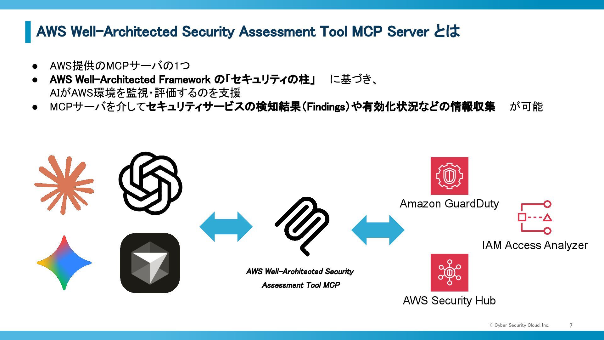 AWS Well-Architected Security Assessment Tool MCPを活用す ることで、セキュリティサービスの有効活用 が捗る • 自社で対応するべきセキュリティ対策がわからないをAIを用いて 解決する支援をしてくれる • 日々のセキュリティサービスの運用の負荷を軽減 してくれる サイバーセキュリティクラウド 公式キャラクターWAF(ワフ)くん