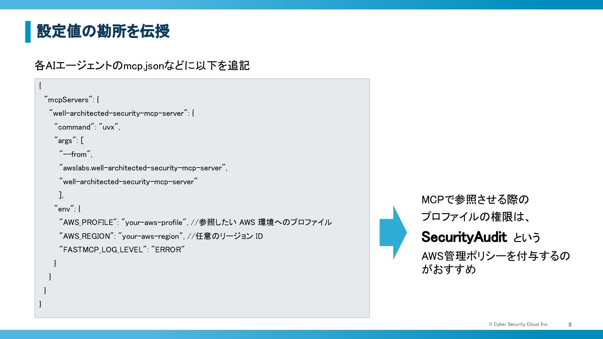 Cyber Security Cloud, Inc. 7 • AWS提供のMCPサーバの1つ • AWS Well-Architected Framework の「セキュリティの柱」 に基づき、 AIがAWS環境を監視・評価するのを支援 • MCPサーバを介してセキュリティサービスの検知結果(Findings)や有効化状況などの情報収集 が可能 AWS Security Hub Amazon GuardDuty IAM Access Analyzer AWS Well-Architected Security Assessment Tool MCP
