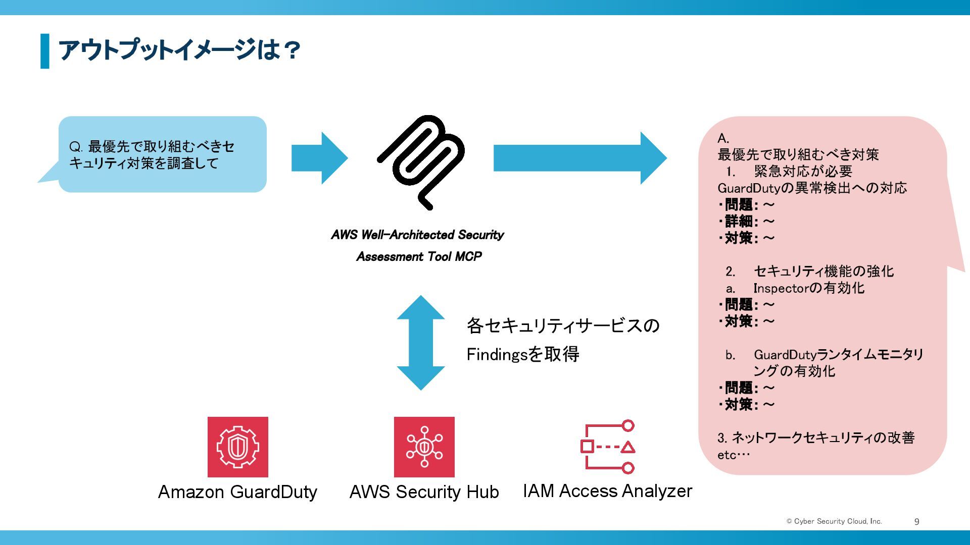 Well-Architected Security Assessment Tool MCP AWS Security Hub Amazon GuardDuty IAM Access Analyzer 各セキュリティサービスの Findingsを取得 Q. 最優先で取り組むべきセ キュリティ対策を調査して A. 最優先で取り組むべき対策 1. 緊急対応が必要 GuardDutyの異常検出への対応 ・問題:~ ・詳細:~ ・対策:~ 2. セキュリティ機能の強化 a. Inspectorの有効化 ・問題:~ ・対策:~ b. GuardDutyランタイムモニタリ ングの有効化 ・問題:~ ・対策:~ 3. ネットワークセキュリティの改善 etc…