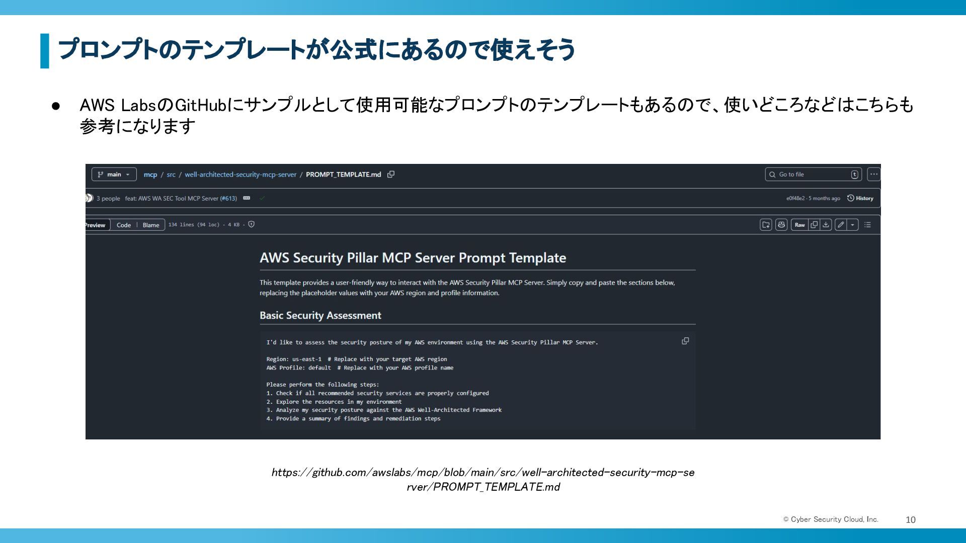 AWS LabsのGitHubにサンプルとして使用可能なプロンプトのテンプレートもあるので、使いどころなどはこちらも 参考になります https://github.com/awslabs/mcp/blob/main/src/well-architected-security-mcp-se rver/PROMPT_TEMPLATE.md
