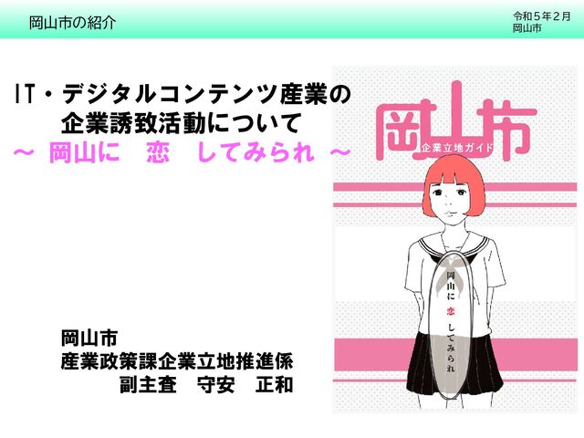 約1,000人 大学院 7校 約3,000人 専修学校専門課程 ≒専門学校 29校 約7,000人 •岡山情報ITクリエイター専門学校 IT・デジタルコンテンツ分野の主な専門学校 IT・デジタルコンテンツ分野の専門学校は充実しているものの、 ゲームソフトウェア業やアニメーション制作業等の企業は岡山にはほとんどない ⇓ •この分野での就職を希望する学生は、東京や大阪等の都市部で就職 •岡山で就職するために、専攻とは異なる職種を選択 •専門学校ではこの分野の講師確保に苦労している •専門学校岡山情報ビジネス学院 •中国デザイン専門学校 •専門学校岡山ビジネスカレッジ 1 岡山市の地域特性 豊富な人材 〇岡山市内の学校数、学生数 6