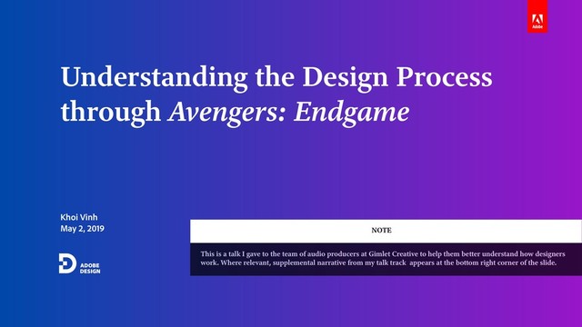 Avengers: Endgame This is a talk I gave to the team of audio producers at Gimlet Creative to help them better understand how designers work. Where relevant, supplemental narrative from my talk track appears at the bottom right corner of the slide. NOTE