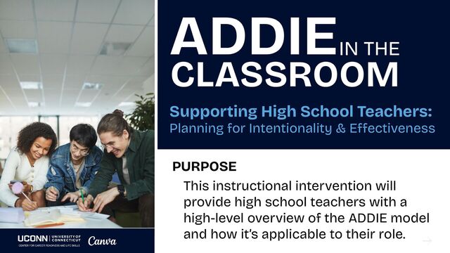 Planning for Intentionality & Effectiveness PURPOSE This instructional intervention will provide high school teachers with a high-level overview of the ADDIE model and how it’s applicable to their role.