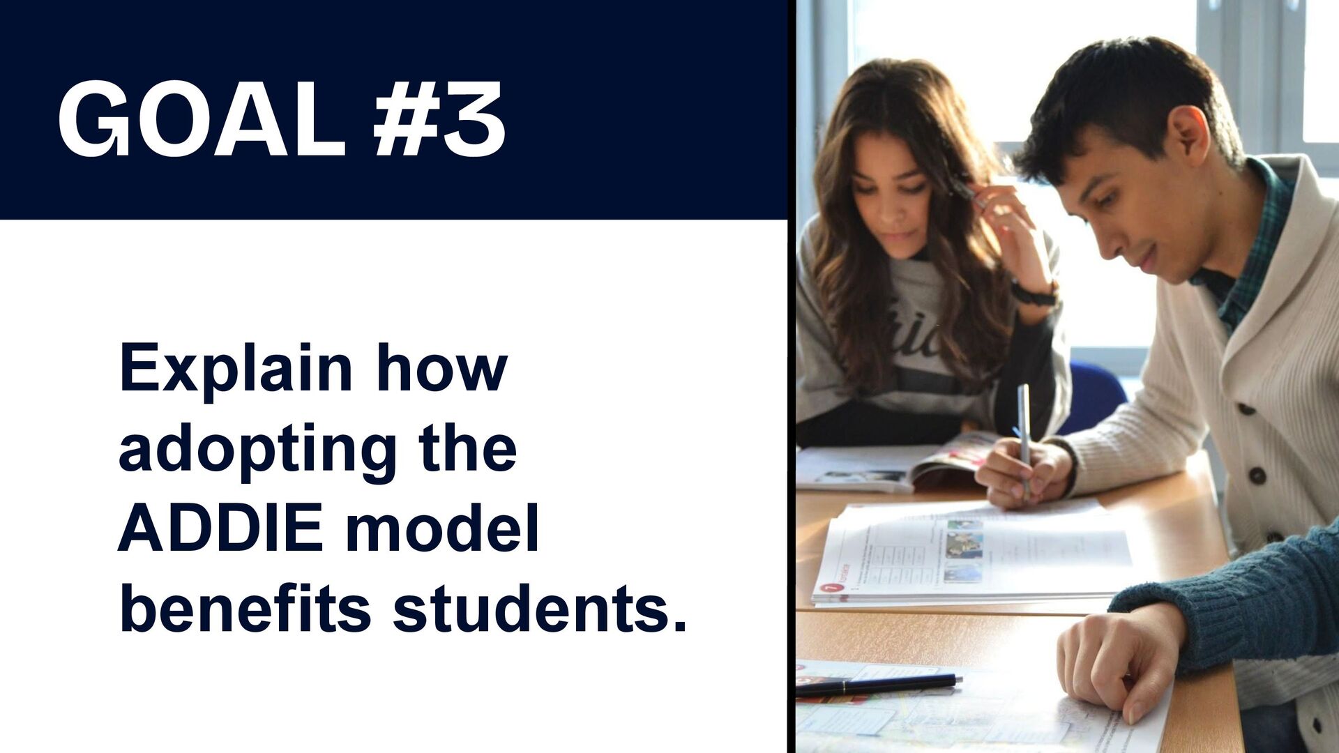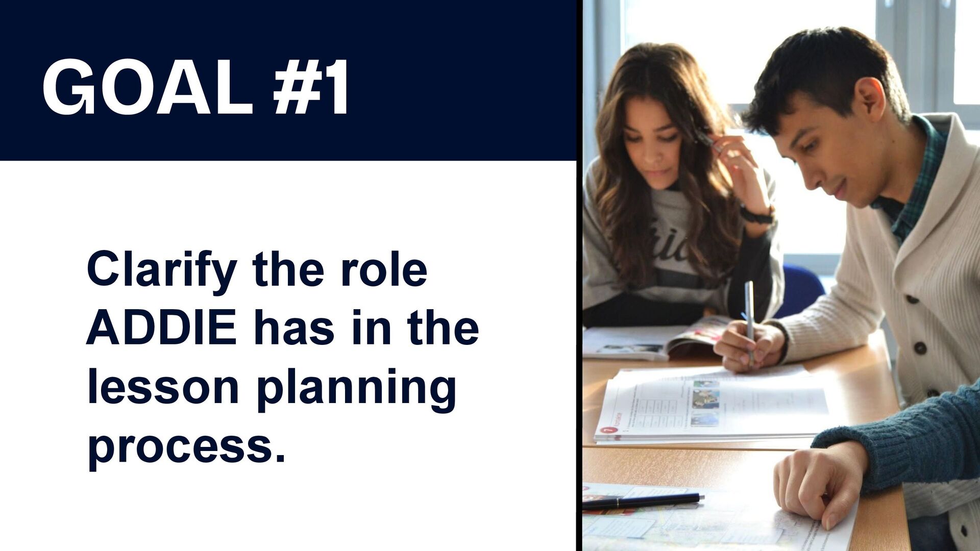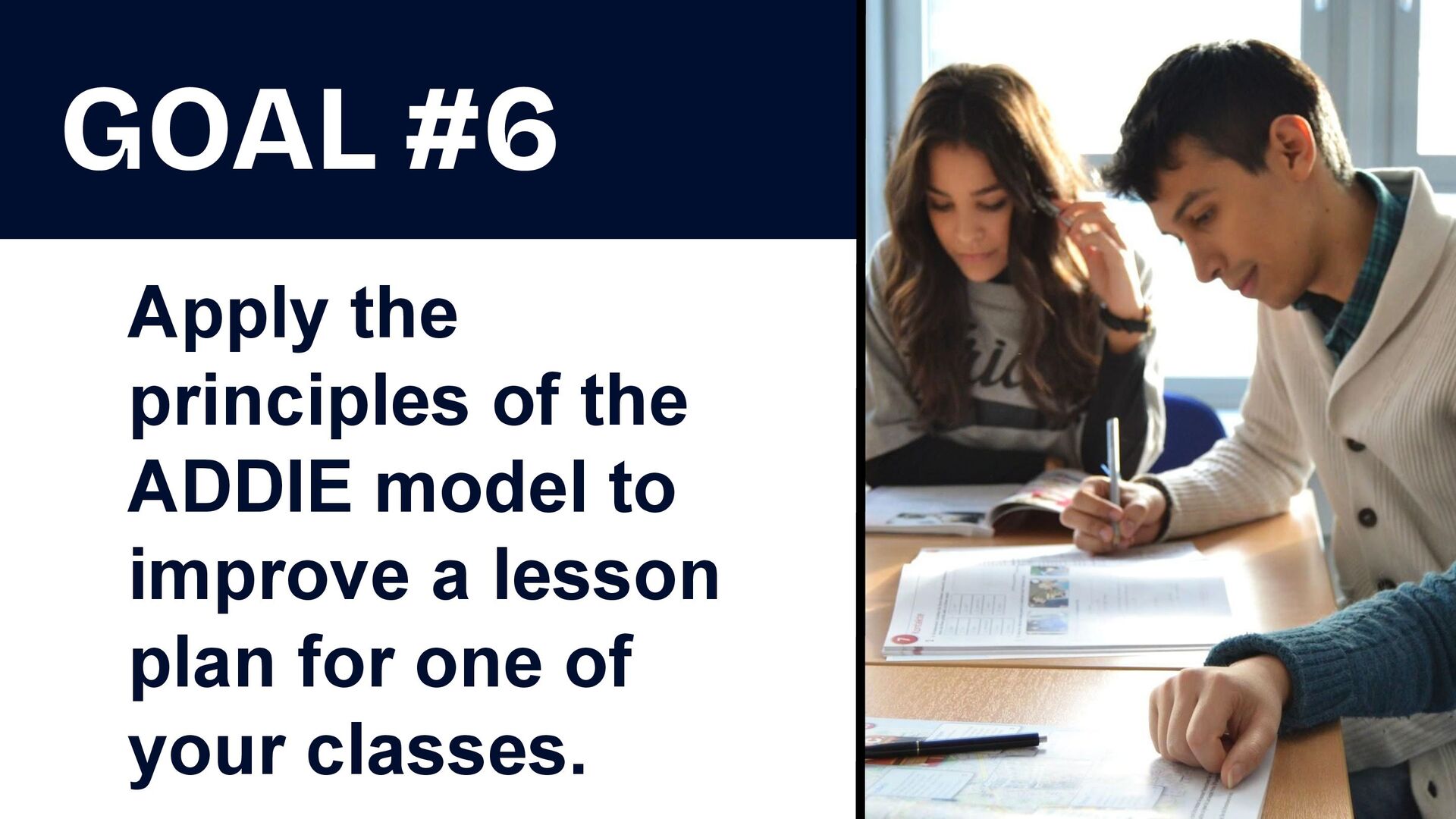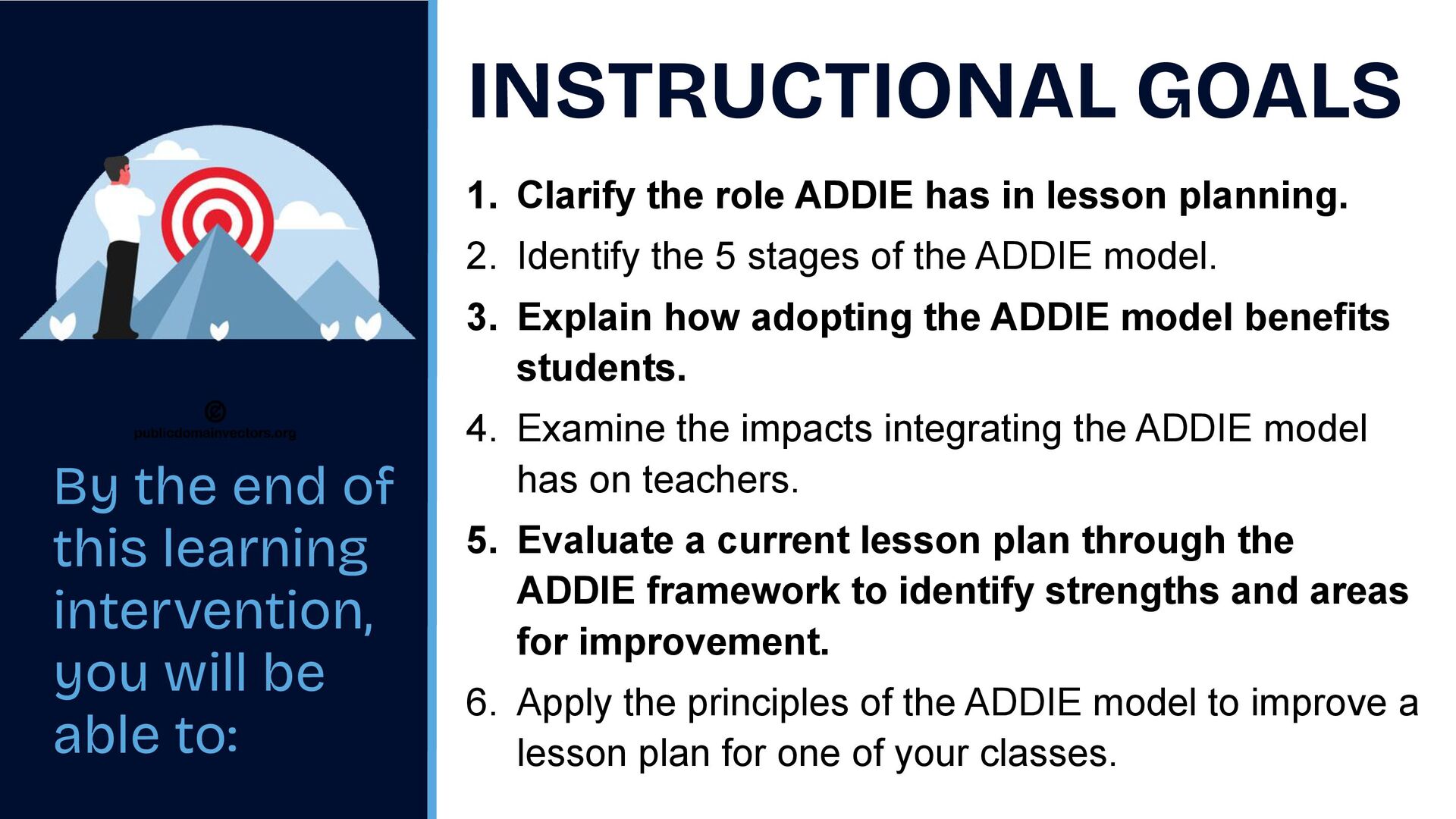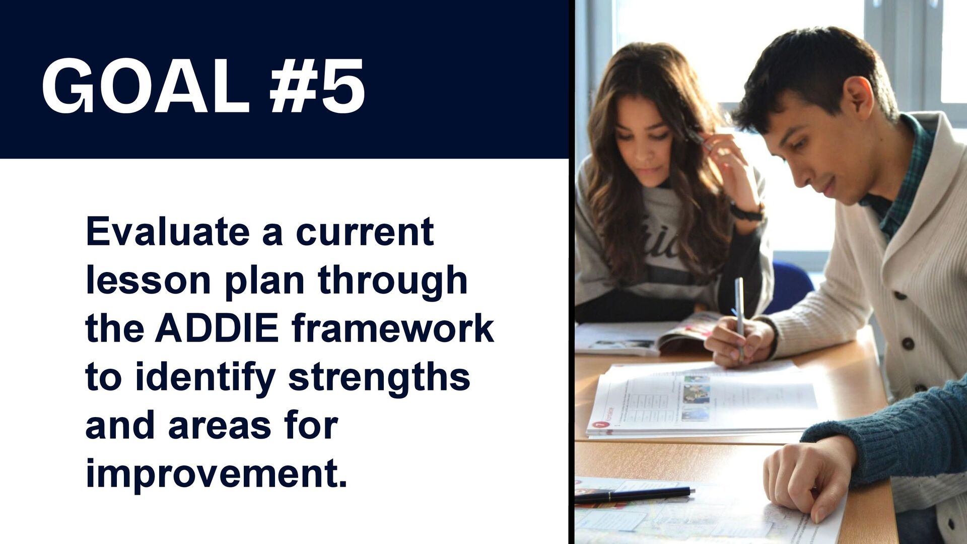 Identify the 5 stages of the ADDIE model. 3. Explain how adopting the ADDIE model benefits students. 4. Examine the impacts integrating the ADDIE model has on teachers. 5. Evaluate a current lesson plan through the ADDIE framework to identify strengths and areas for improvement. 6. Apply the principles of the ADDIE model to improve a lesson plan for one of your classes. INSTRUCTIONAL GOALS By the end of this learning intervention, you will be able to: