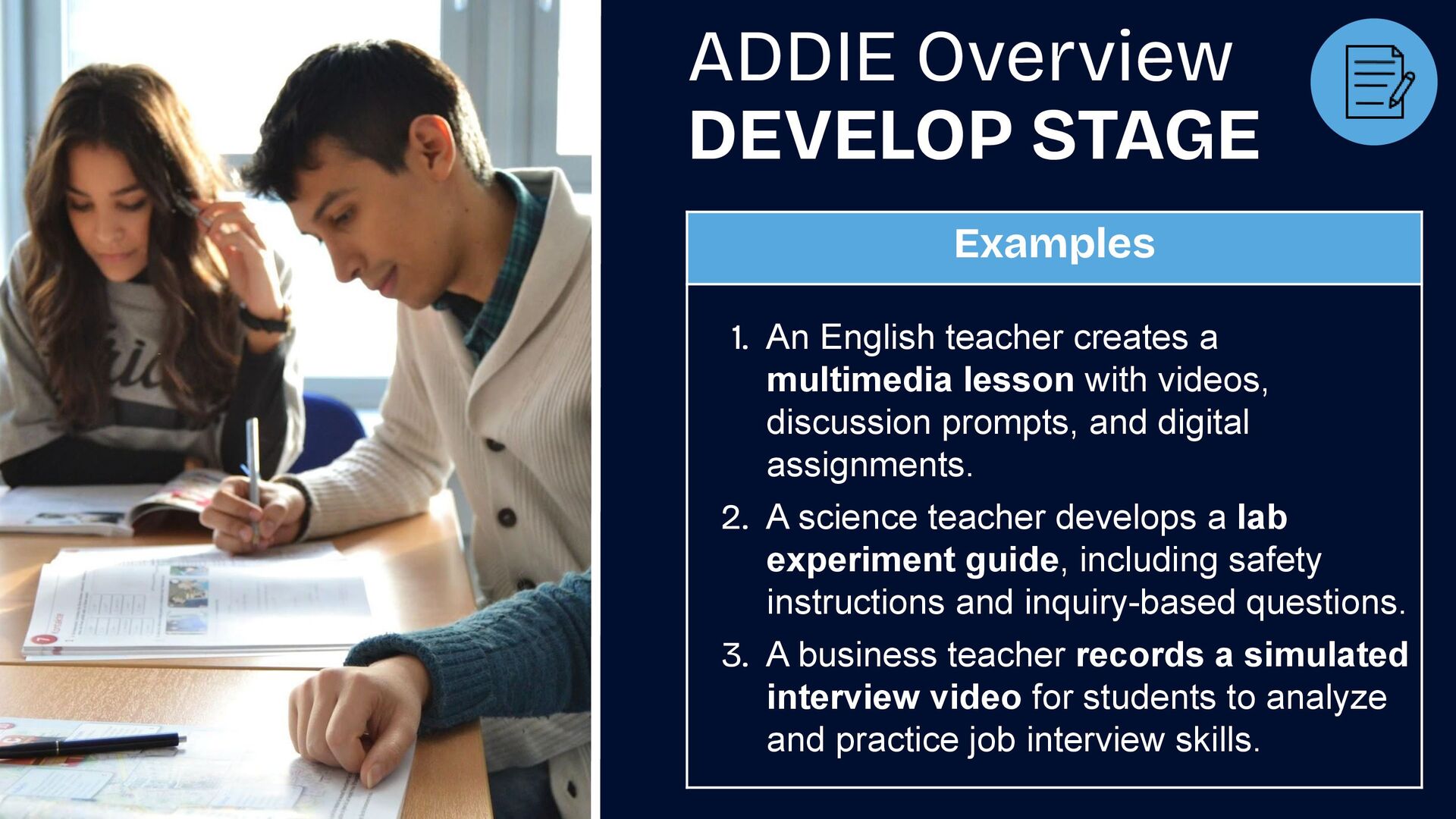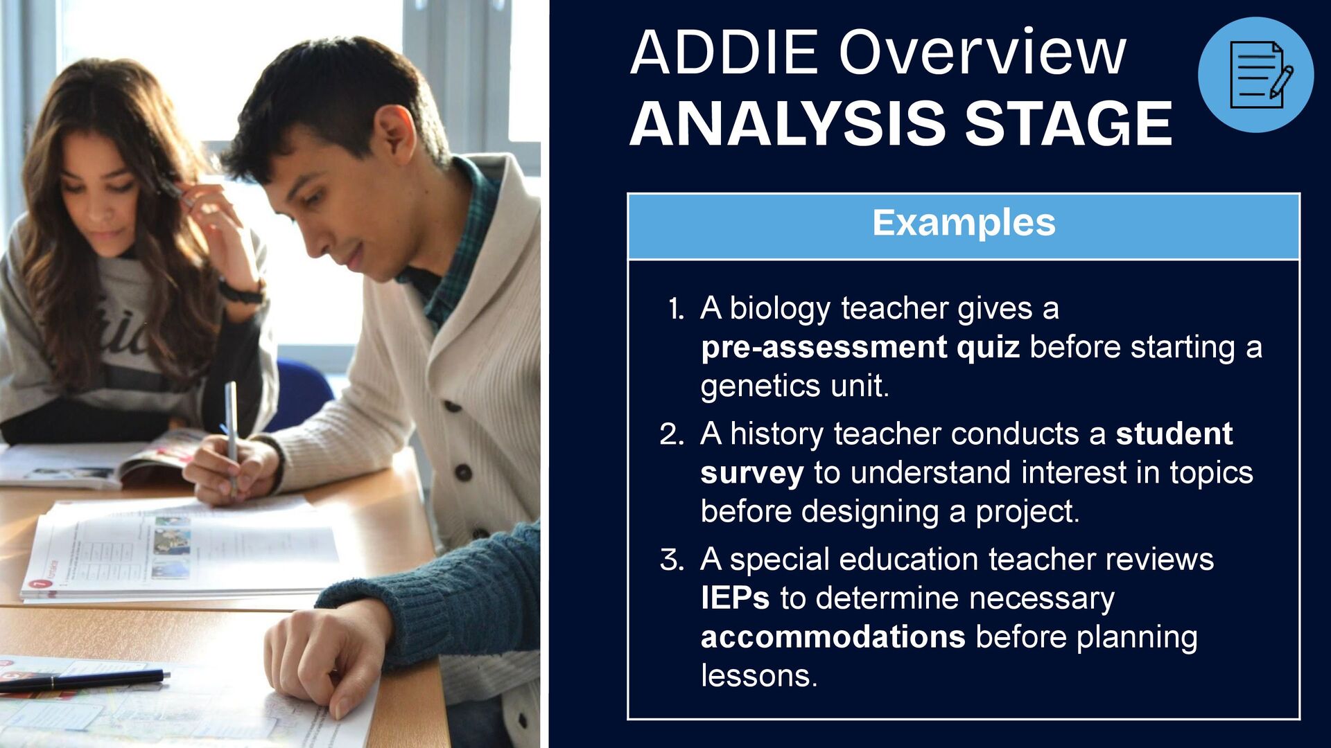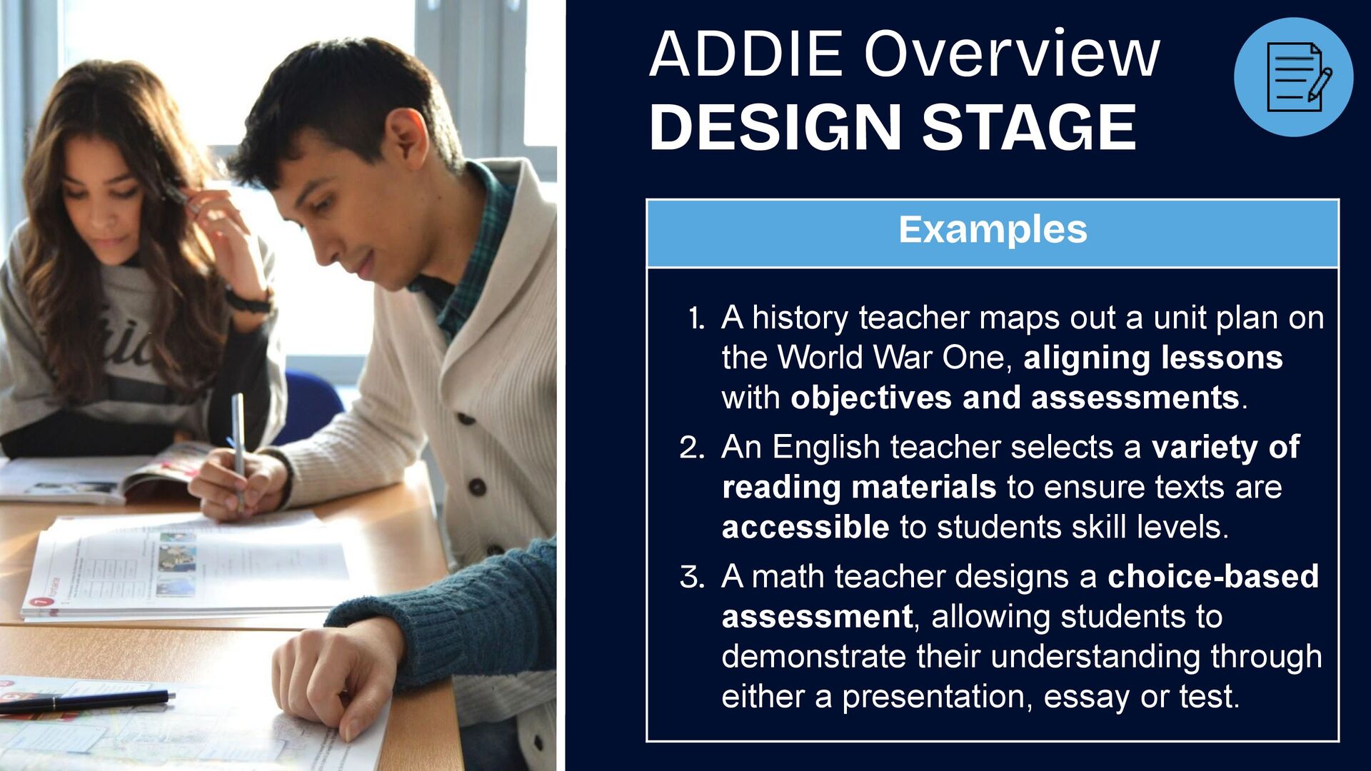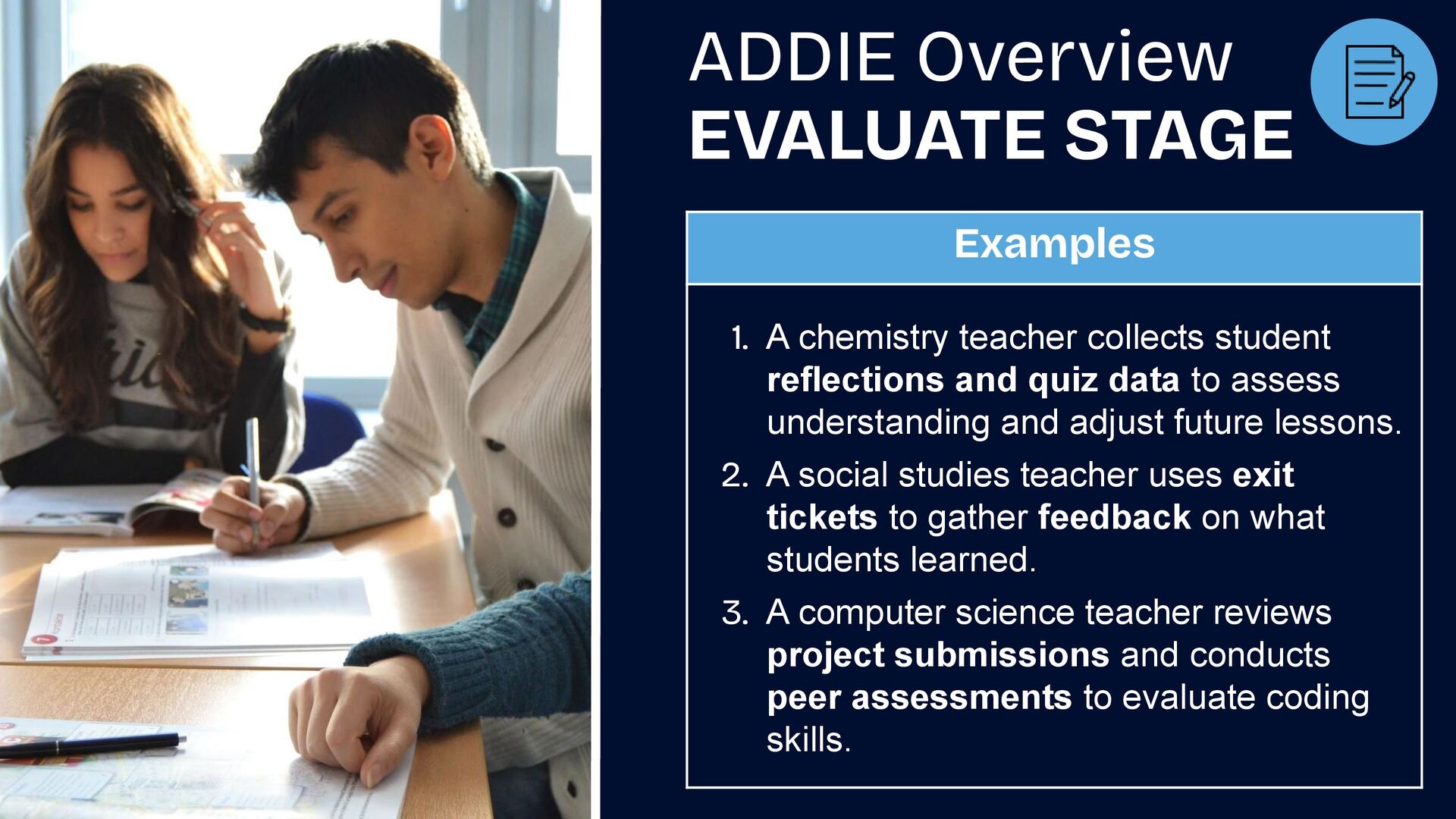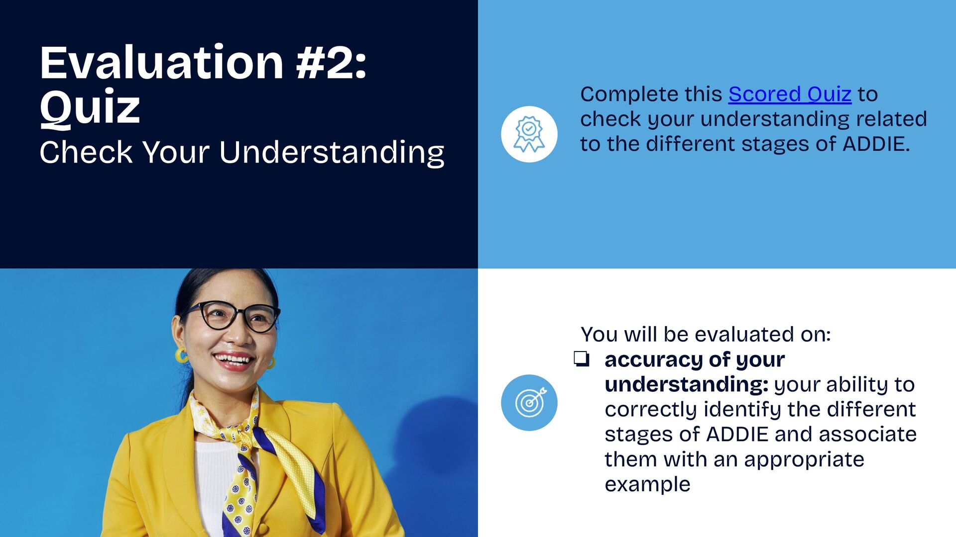your ability to correctly identify the different stages of ADDIE and associate them with an appropriate example Evaluation #2: Quiz Check Your Understanding Complete this Scored Quiz to check your understanding related to the different stages of ADDIE.