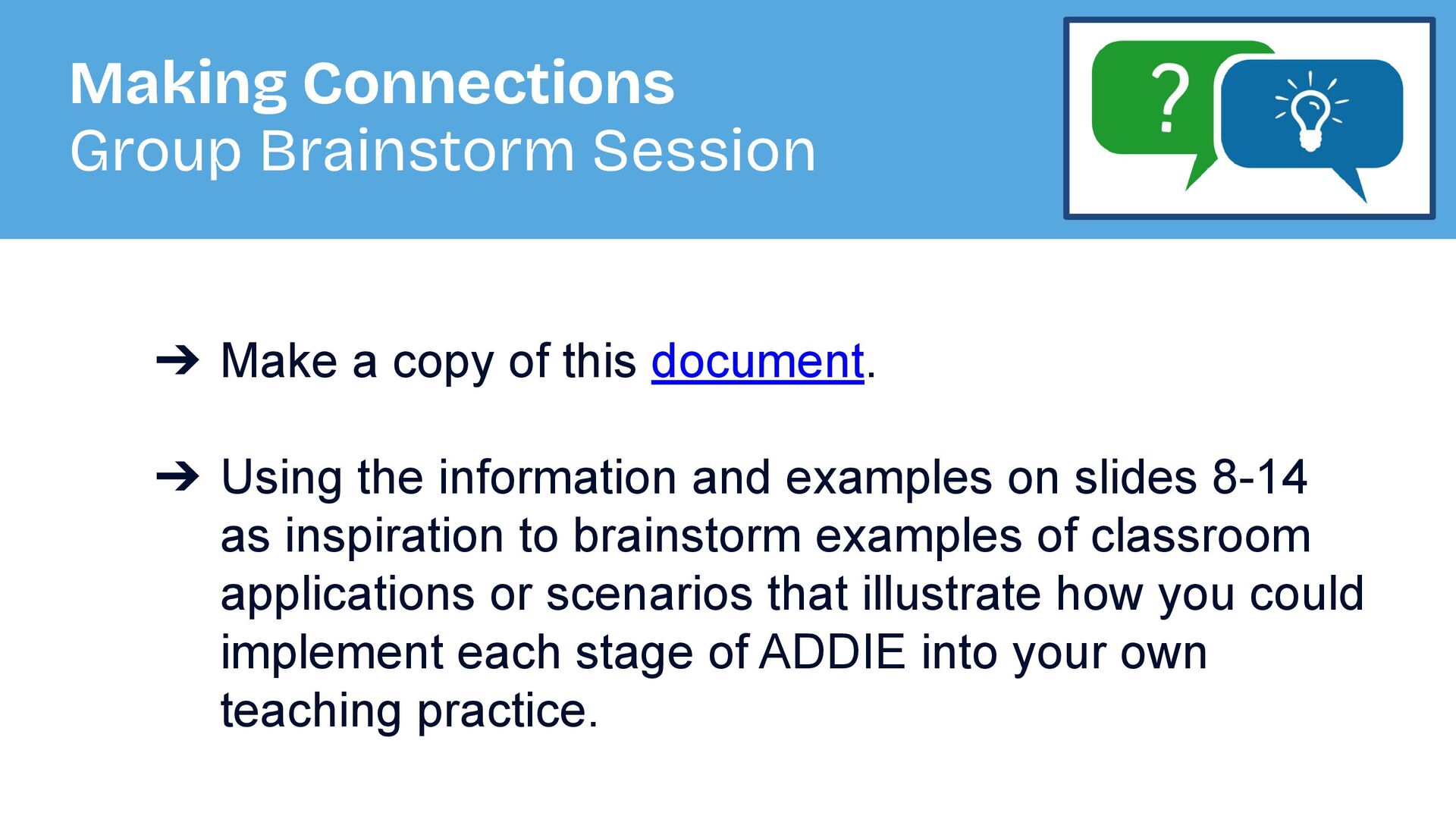 this document. ➔ Using the information and examples on slides 8-14 as inspiration to brainstorm examples of classroom applications or scenarios that illustrate how you could implement each stage of ADDIE into your own teaching practice.