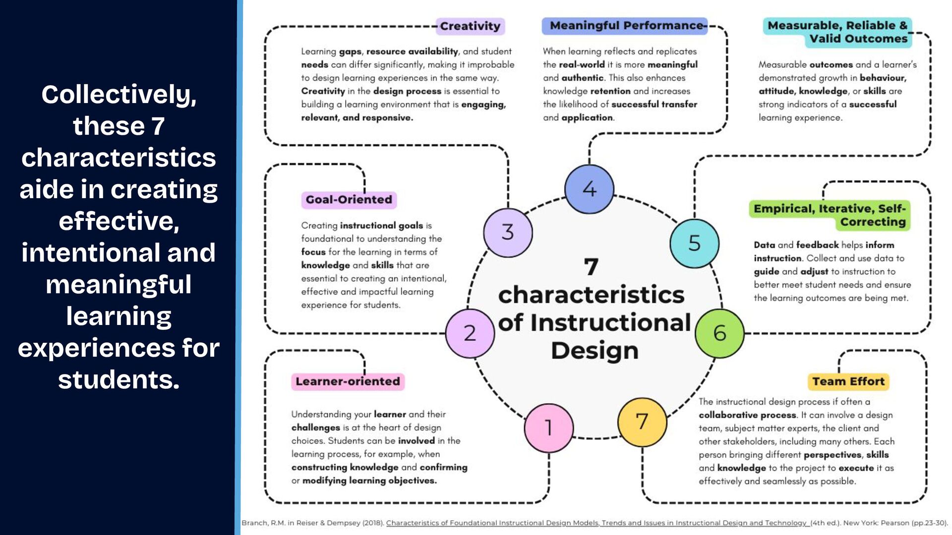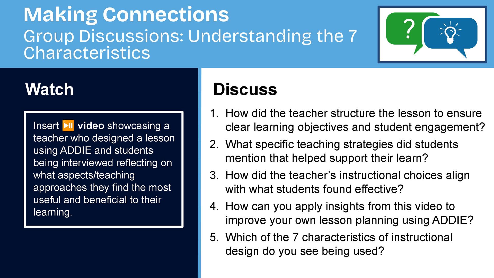 video showcasing a teacher who designed a lesson using ADDIE and students being interviewed reflecting on what aspects/teaching approaches they find the most useful and beneficial to their learning. Watch Discuss 1. How did the teacher structure the lesson to ensure clear learning objectives and student engagement? 2. What specific teaching strategies did students mention that helped support their learn? 3. How did the teacher’s instructional choices align with what students found effective? 4. How can you apply insights from this video to improve your own lesson planning using ADDIE? 5. Which of the 7 characteristics of instructional design do you see being used?