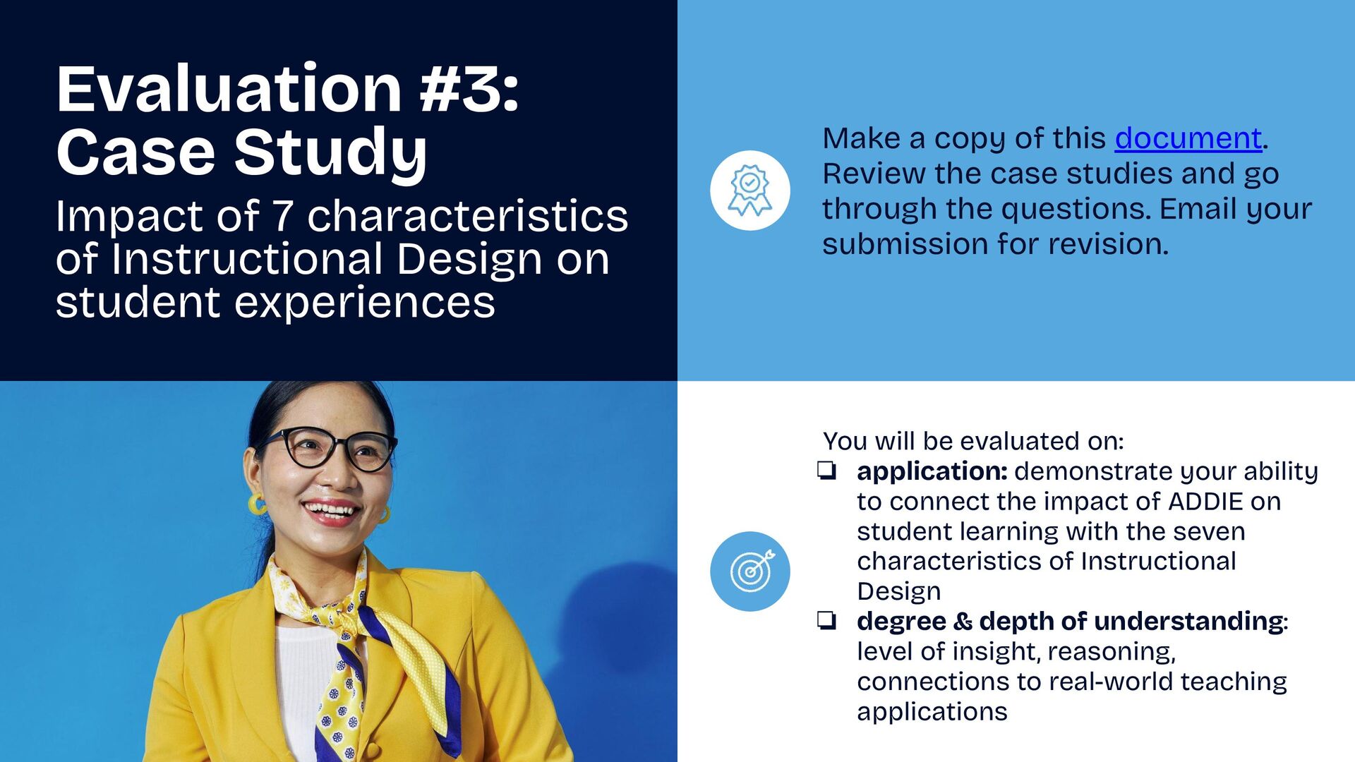 to connect the impact of ADDIE on student learning with the seven characteristics of Instructional Design ❏ degree & depth of understanding: level of insight, reasoning, connections to real-world teaching applications Evaluation #3: Case Study Impact of 7 characteristics of Instructional Design on student experiences Make a copy of this document. Review the case studies and go through the questions. Email your submission for revision.