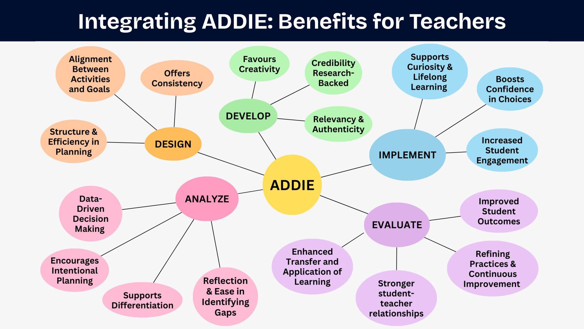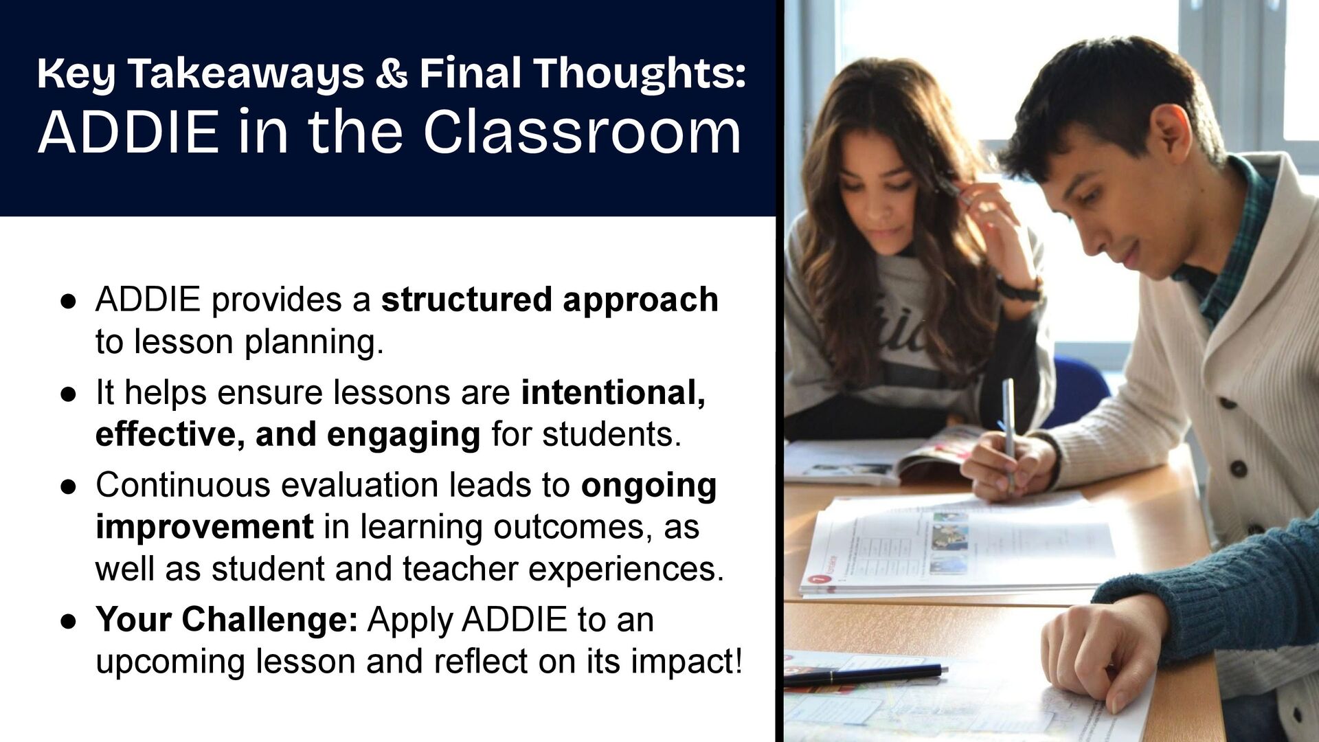 ADDIE provides a structured approach to lesson planning. • It helps ensure lessons are intentional, effective, and engaging for students. • Continuous evaluation leads to ongoing improvement in learning outcomes, as well as student and teacher experiences. • Your Challenge: Apply ADDIE to an upcoming lesson and reflect on its impact!