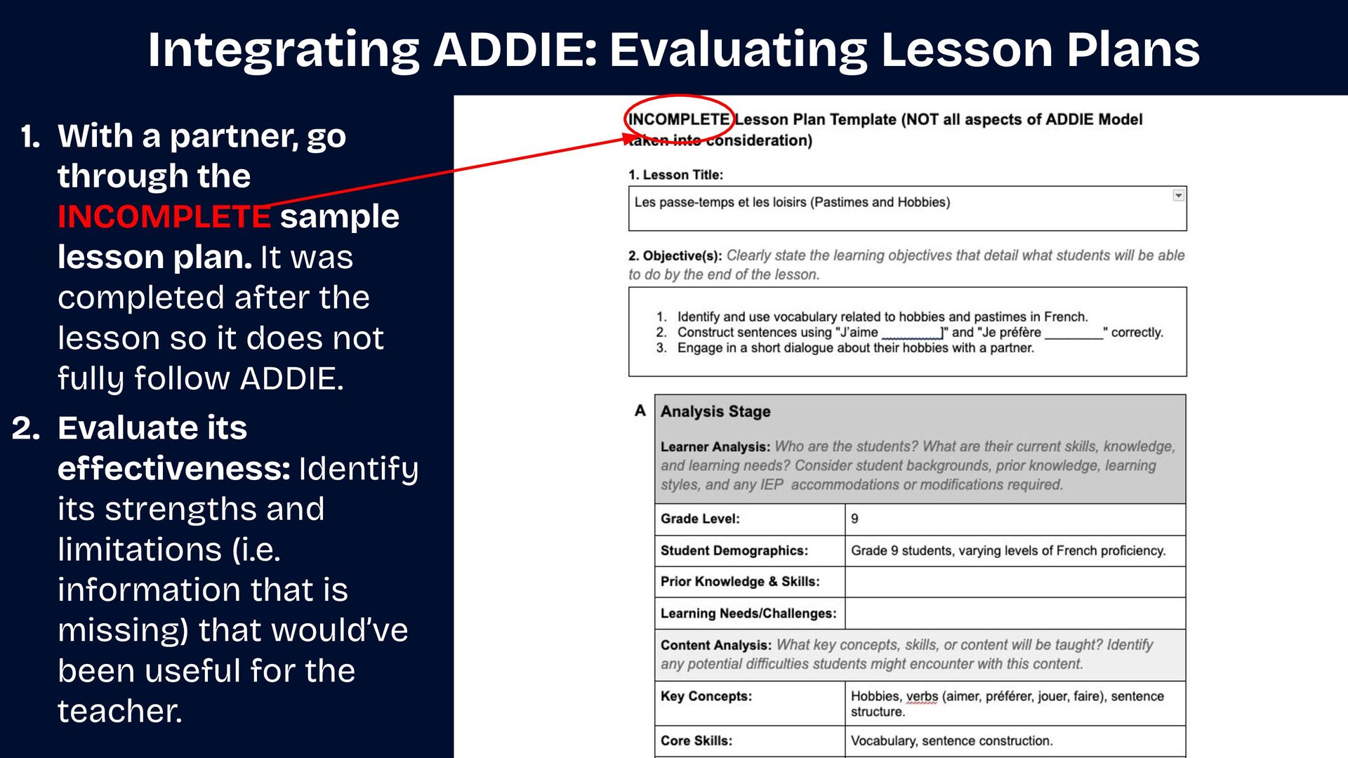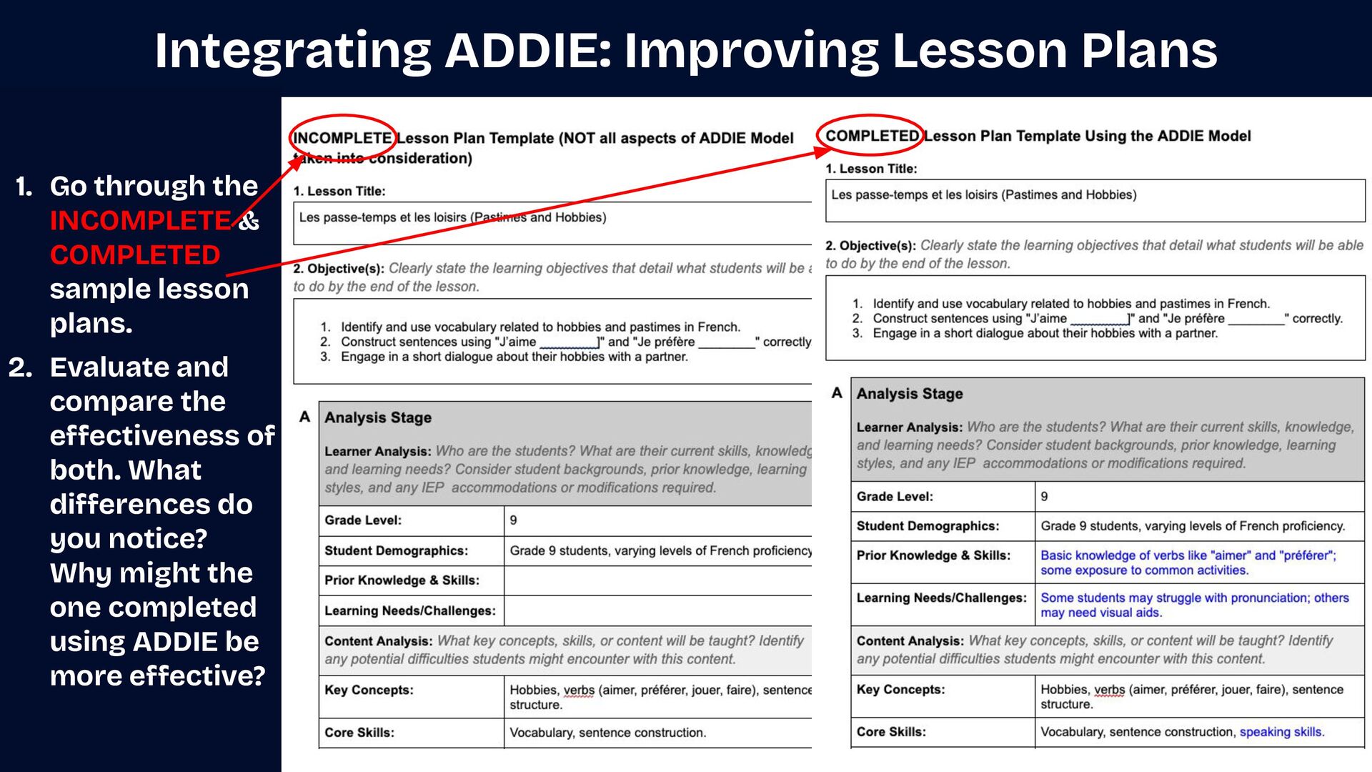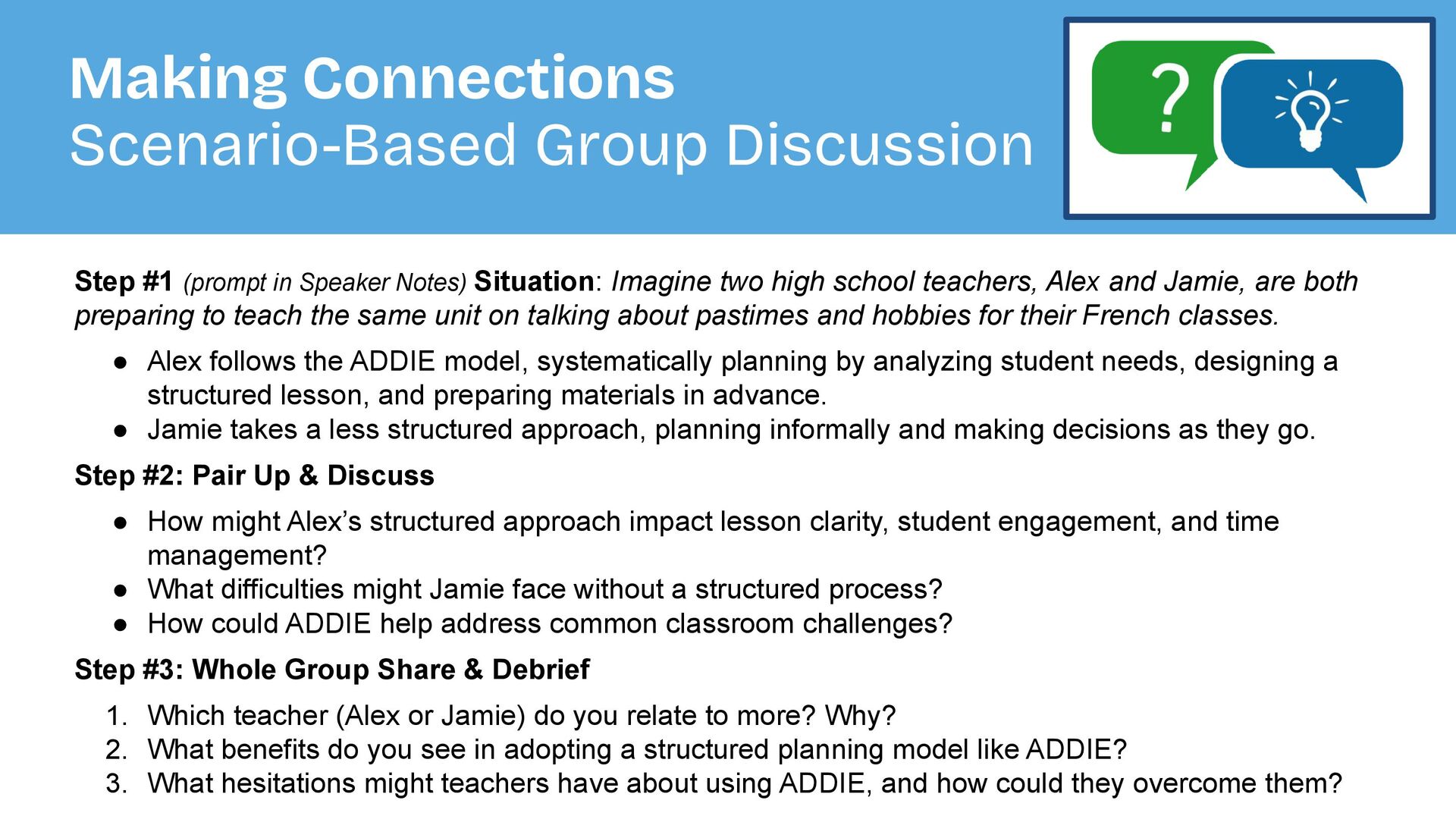 Notes) Situation: Imagine two high school teachers, Alex and Jamie, are both preparing to teach the same unit on talking about pastimes and hobbies for their French classes. • Alex follows the ADDIE model, systematically planning by analyzing student needs, designing a structured lesson, and preparing materials in advance. • Jamie takes a less structured approach, planning informally and making decisions as they go. Step #2: Pair Up & Discuss • How might Alex’s structured approach impact lesson clarity, student engagement, and time management? • What difficulties might Jamie face without a structured process? • How could ADDIE help address common classroom challenges? Step #3: Whole Group Share & Debrief 1. Which teacher (Alex or Jamie) do you relate to more? Why? 2. What benefits do you see in adopting a structured planning model like ADDIE? 3. What hesitations might teachers have about using ADDIE, and how could they overcome them?