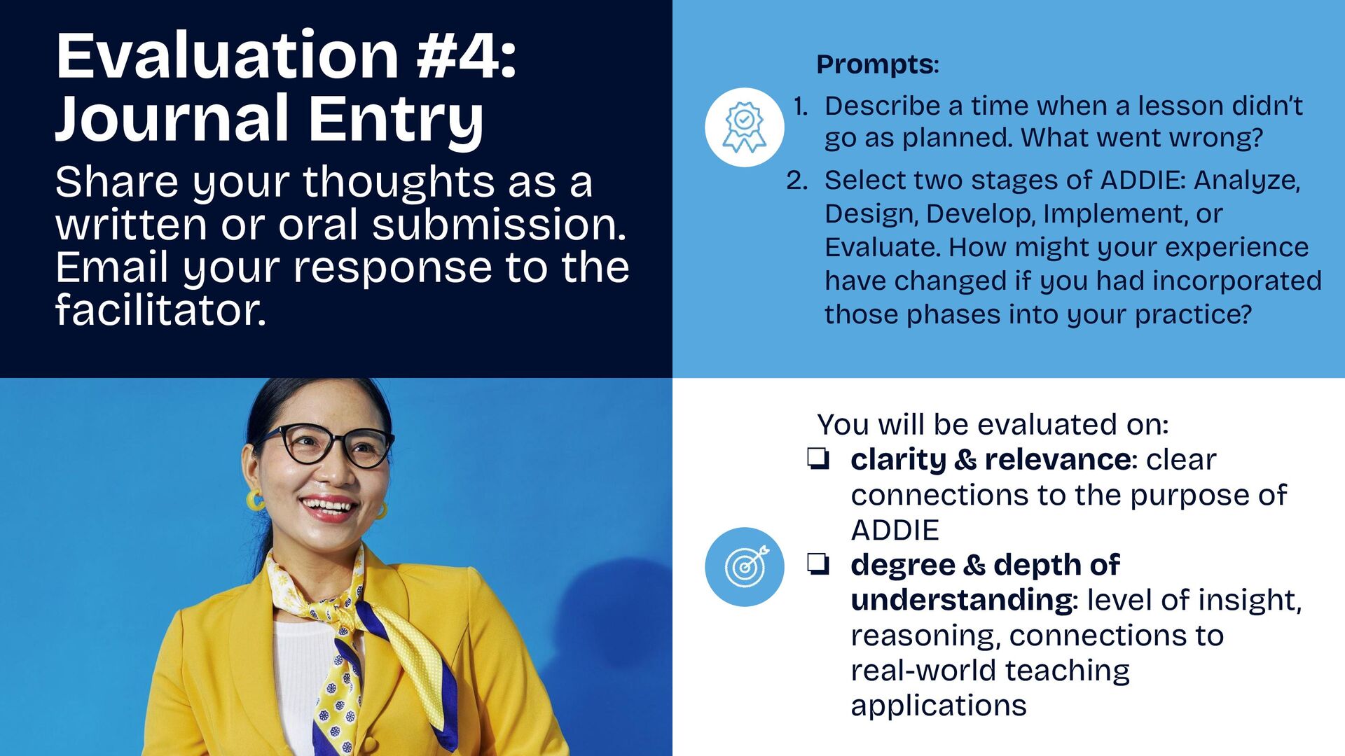 connections to the purpose of ADDIE ❏ degree & depth of understanding: level of insight, reasoning, connections to real-world teaching applications Evaluation #4: Journal Entry Share your thoughts as a written or oral submission. Email your response to the facilitator. Prompts: 1. Describe a time when a lesson didn’t go as planned. What went wrong? 2. Select two stages of ADDIE: Analyze, Design, Develop, Implement, or Evaluate. How might your experience have changed if you had incorporated those phases into your practice?
