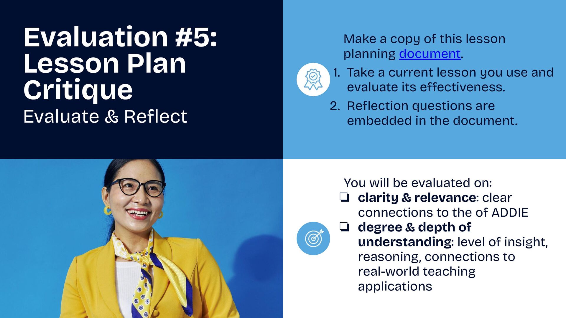 connections to the of ADDIE ❏ degree & depth of understanding: level of insight, reasoning, connections to real-world teaching applications Evaluation #5: Lesson Plan Critique Evaluate & Reflect Make a copy of this lesson planning document. 1. Take a current lesson you use and evaluate its effectiveness. 2. Reflection questions are embedded in the document.