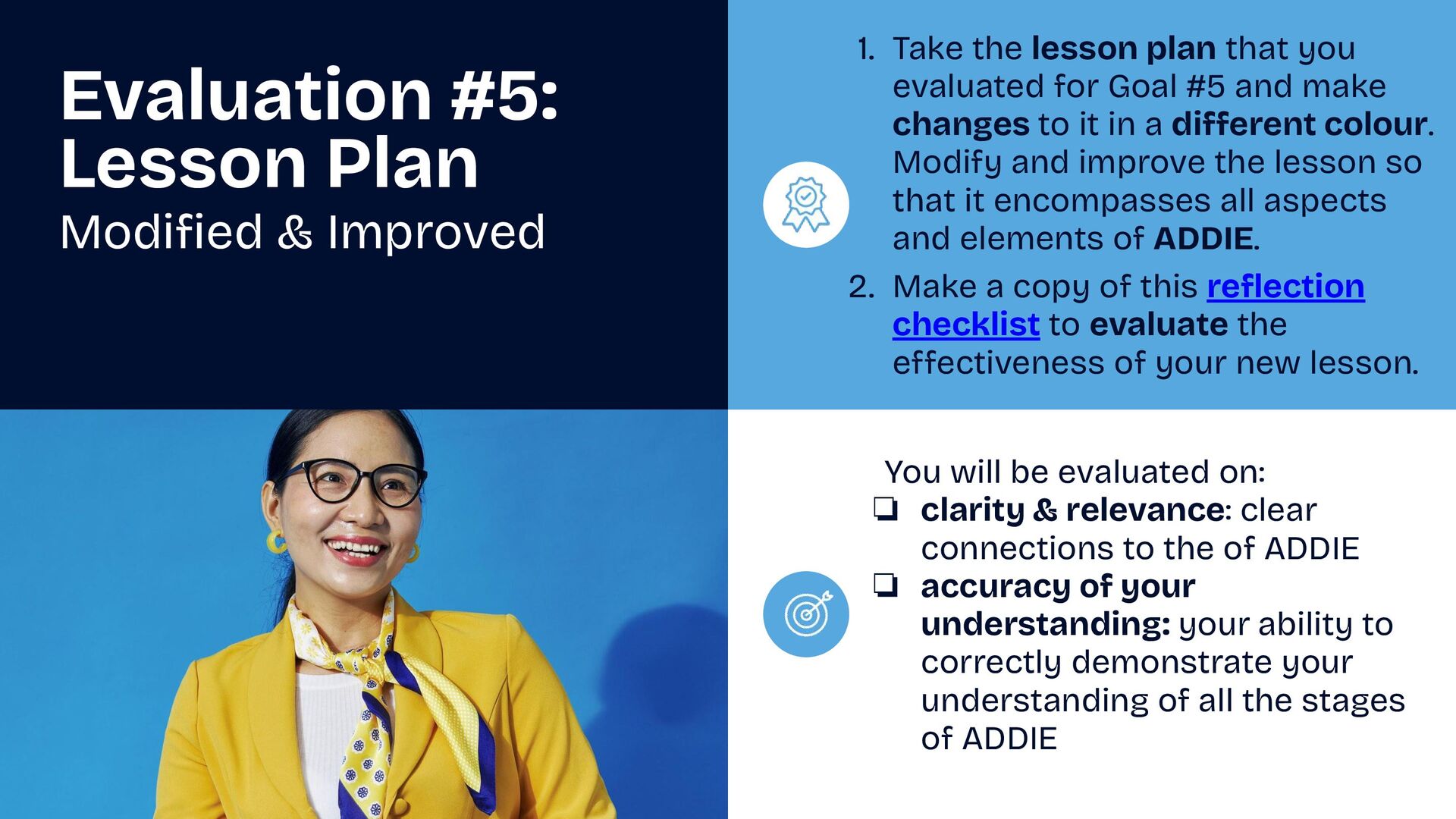 connections to the of ADDIE ❏ accuracy of your understanding: your ability to correctly demonstrate your understanding of all the stages of ADDIE Evaluation #5: Lesson Plan Modified & Improved 1. Take the lesson plan that you evaluated for Goal #5 and make changes to it in a different colour. Modify and improve the lesson so that it encompasses all aspects and elements of ADDIE. 2. Make a copy of this reflection checklist to evaluate the effectiveness of your new lesson.