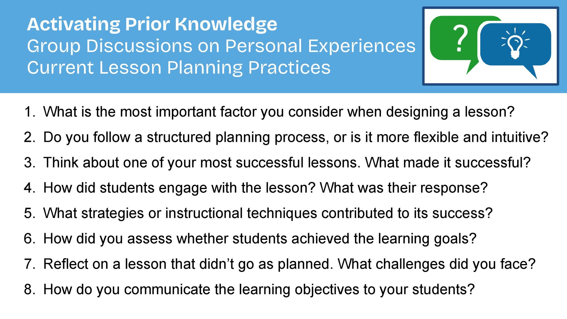 Planning Practices 1. What is the most important factor you consider when designing a lesson? 2. Do you follow a structured planning process, or is it more flexible and intuitive? 3. Think about one of your most successful lessons. What made it successful? 4. How did students engage with the lesson? What was their response? 5. What strategies or instructional techniques contributed to its success? 6. How did you assess whether students achieved the learning goals? 7. Reflect on a lesson that didn’t go as planned. What challenges did you face? 8. How do you communicate the learning objectives to your students?