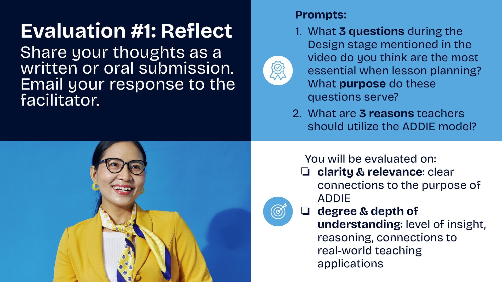 connections to the purpose of ADDIE ❏ degree & depth of understanding: level of insight, reasoning, connections to real-world teaching applications Evaluation #1: Reflect Share your thoughts as a written or oral submission. Email your response to the facilitator. Prompts: 1. What 3 questions during the Design stage mentioned in the video do you think are the most essential when lesson planning? What purpose do these questions serve? 2. What are 3 reasons teachers should utilize the ADDIE model?