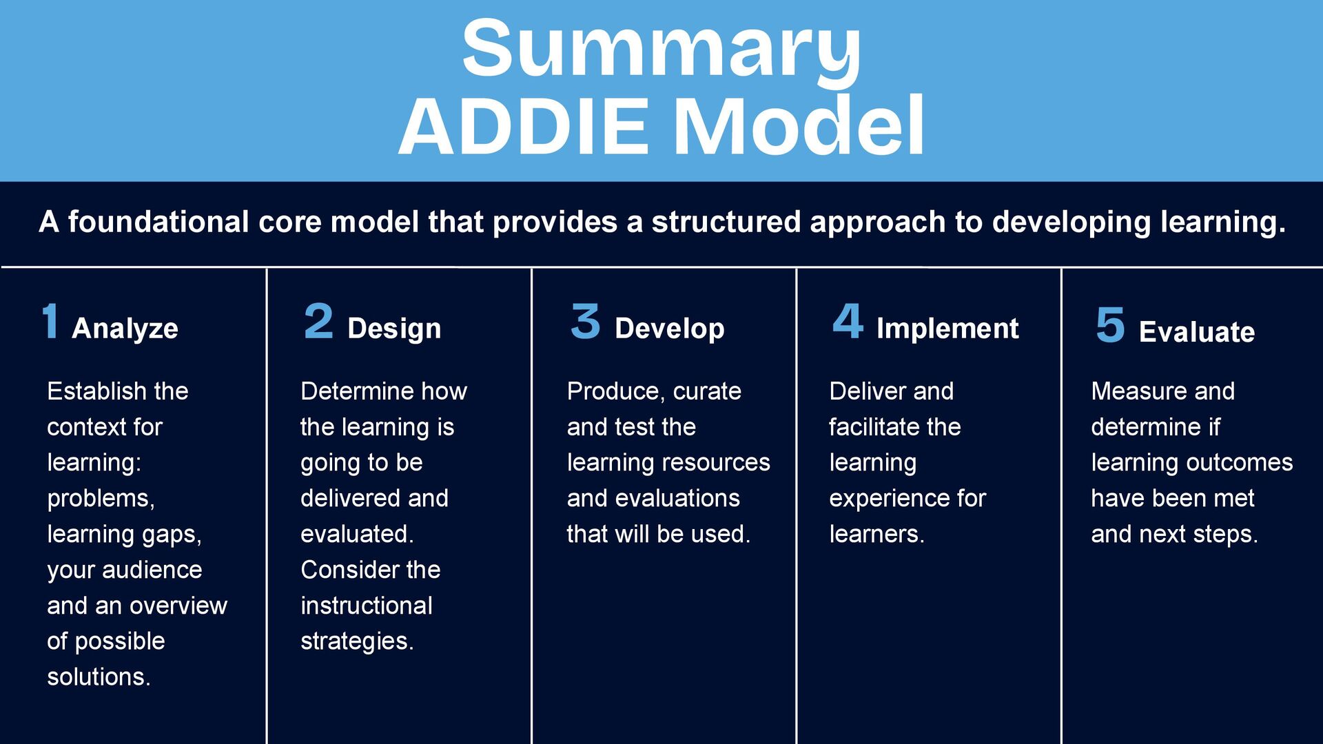 Develop 2 Design Establish the context for learning: problems, learning gaps, your audience and an overview of possible solutions. Deliver and facilitate the learning experience for learners. Measure and determine if learning outcomes have been met and next steps. Produce, curate and test the learning resources and evaluations that will be used. Determine how the learning is going to be delivered and evaluated. Consider the instructional strategies. A foundational core model that provides a structured approach to developing learning.
