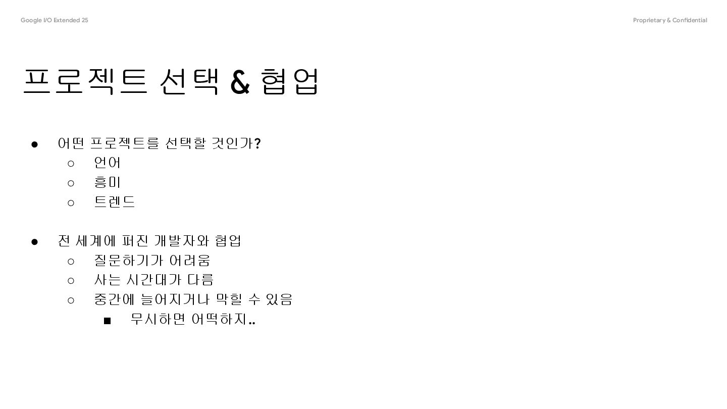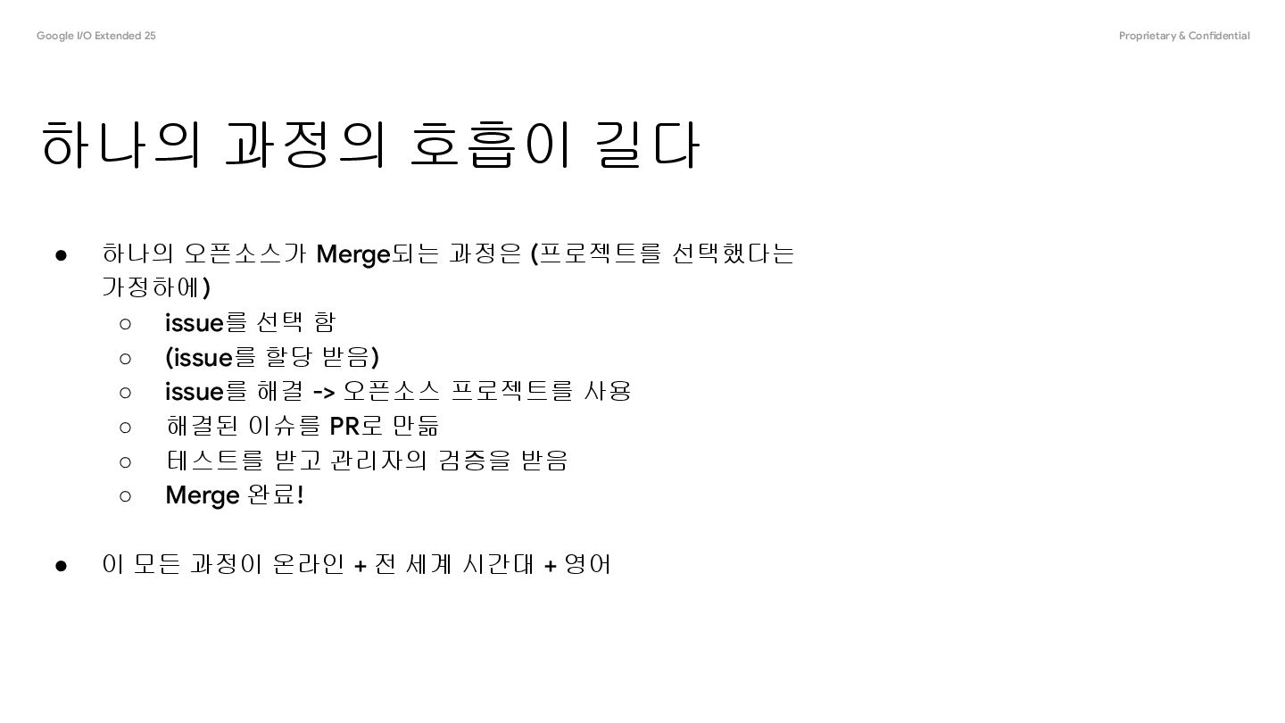 Merge되는 과정은 (프로젝트를 선택했다는 가정하에) ◦ issue를 선택 함 ◦ (issue를 할당 받음) ◦ issue를 해결 -> 오픈소스 프로젝트를 사용 ◦ 해결된 이슈를 PR로 만듦 ◦ 테스트를 받고 관리자의 검증을 받음 ◦ Merge 완료! • 이 모든 과정이 온라인 + 전 세계 시간대 + 영어 하나의 과정의 호흡이 길다